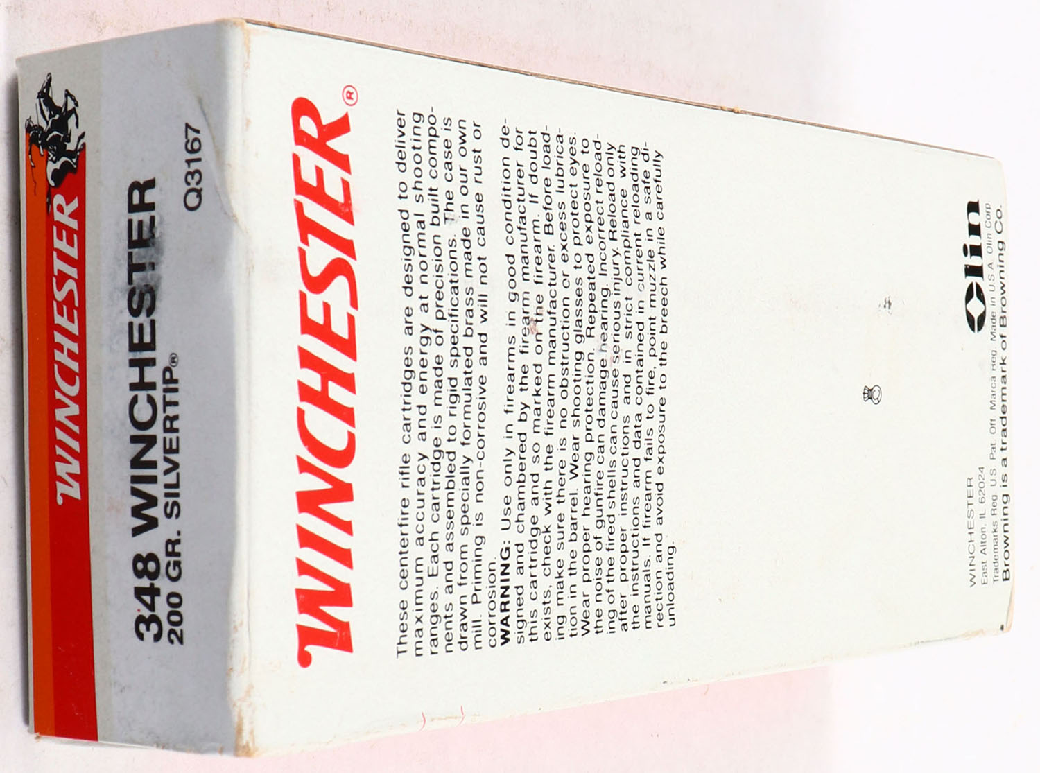 Winchester, Commemorative Ammunition for Browning Model '71, .348 Winchester, 200 Grain Silvertip, Full, 1pc. White & black box, box is solid with excellent color, some shelf wear, very minor corner wear, edges are mostly crisp, end flaps are solid, ammo is excellent. Grade: Excellent + - Value: 50 to 150
