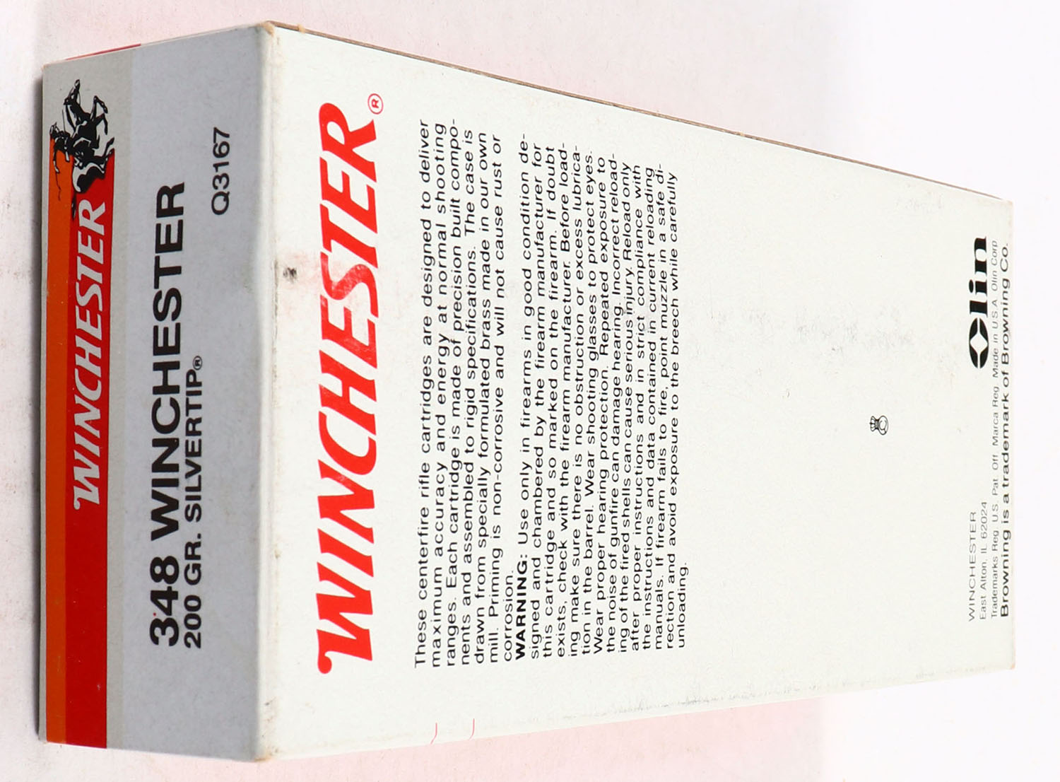 Winchester, Commemorative Ammunition for Browning Model '71, .348 Winchester, 200 Grain Silvertip, Full, 1pc. White & black box, box is solid with excellent color, some shelf wear, very minor corner wear, edges are mostly crisp, end flaps are solid, ammo is excellent. Grade: Excellent + - Value: 50 to 150