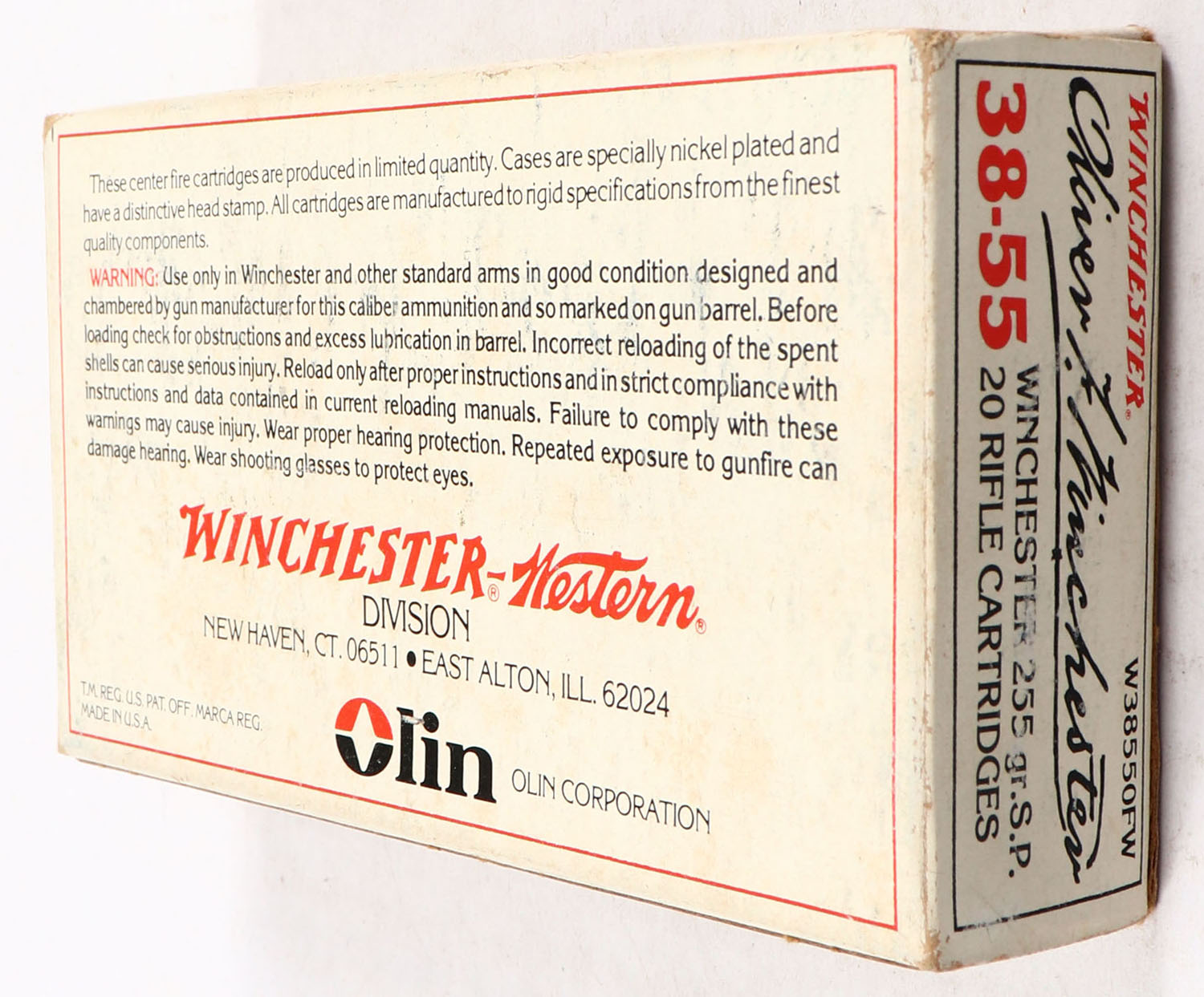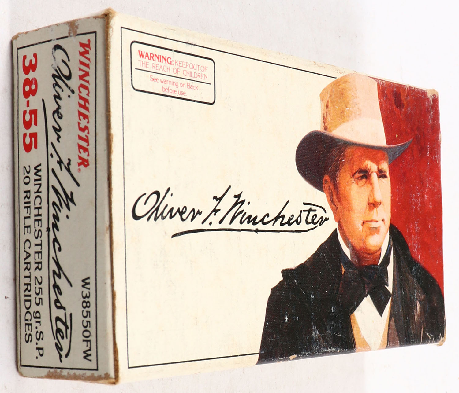Winchester, Oliver F. Winchester, .38-55 Winchester, 255 Grain Soft Point, Full, 1pc. White box picturing Oliver Winchester, box is solid with excellent color, minor shelf wear, corners are mostly sharp, edges are crisp, end flaps are solid, ammo is excellent. Grade: Excellent + - Value: 30 to 90