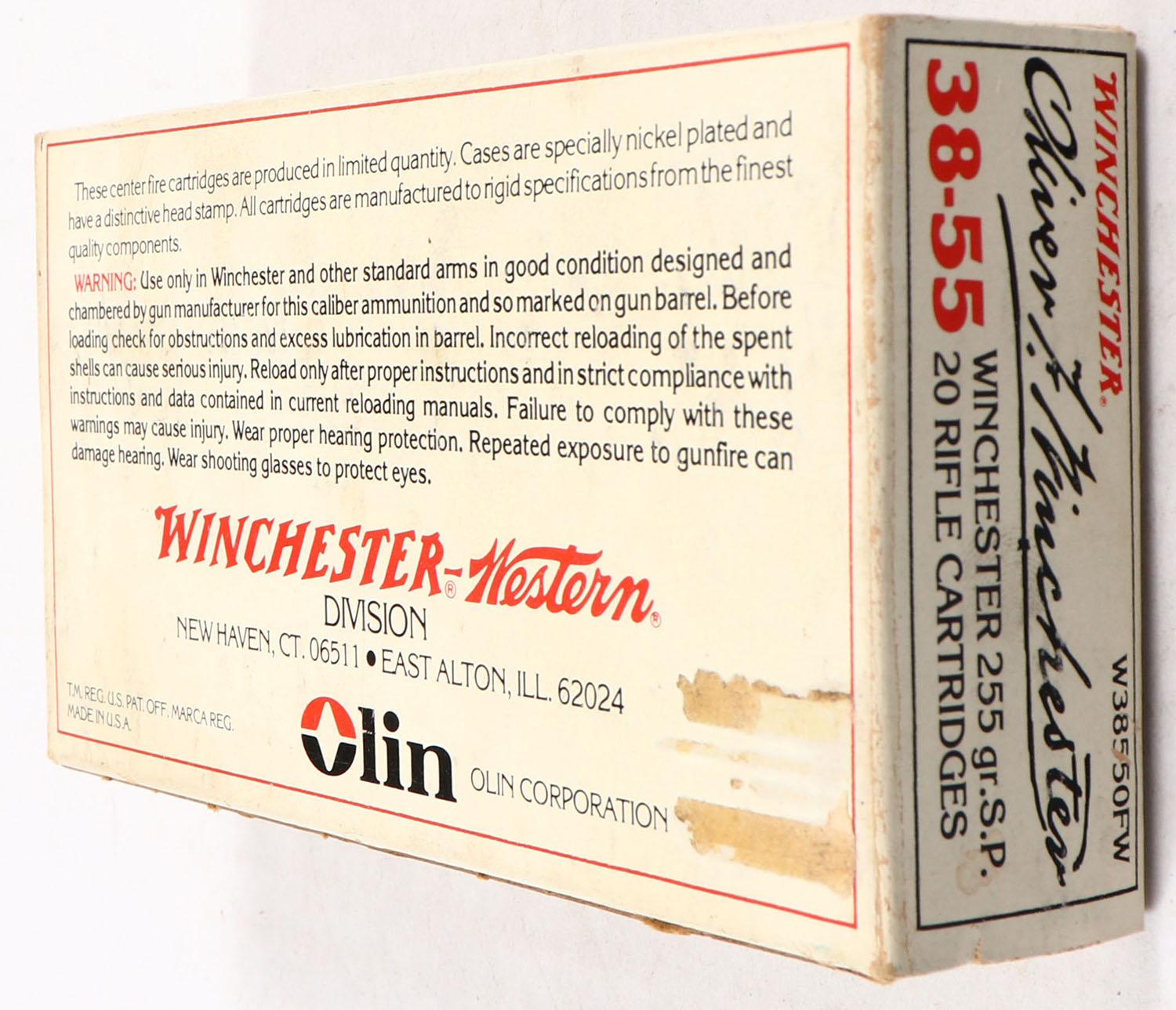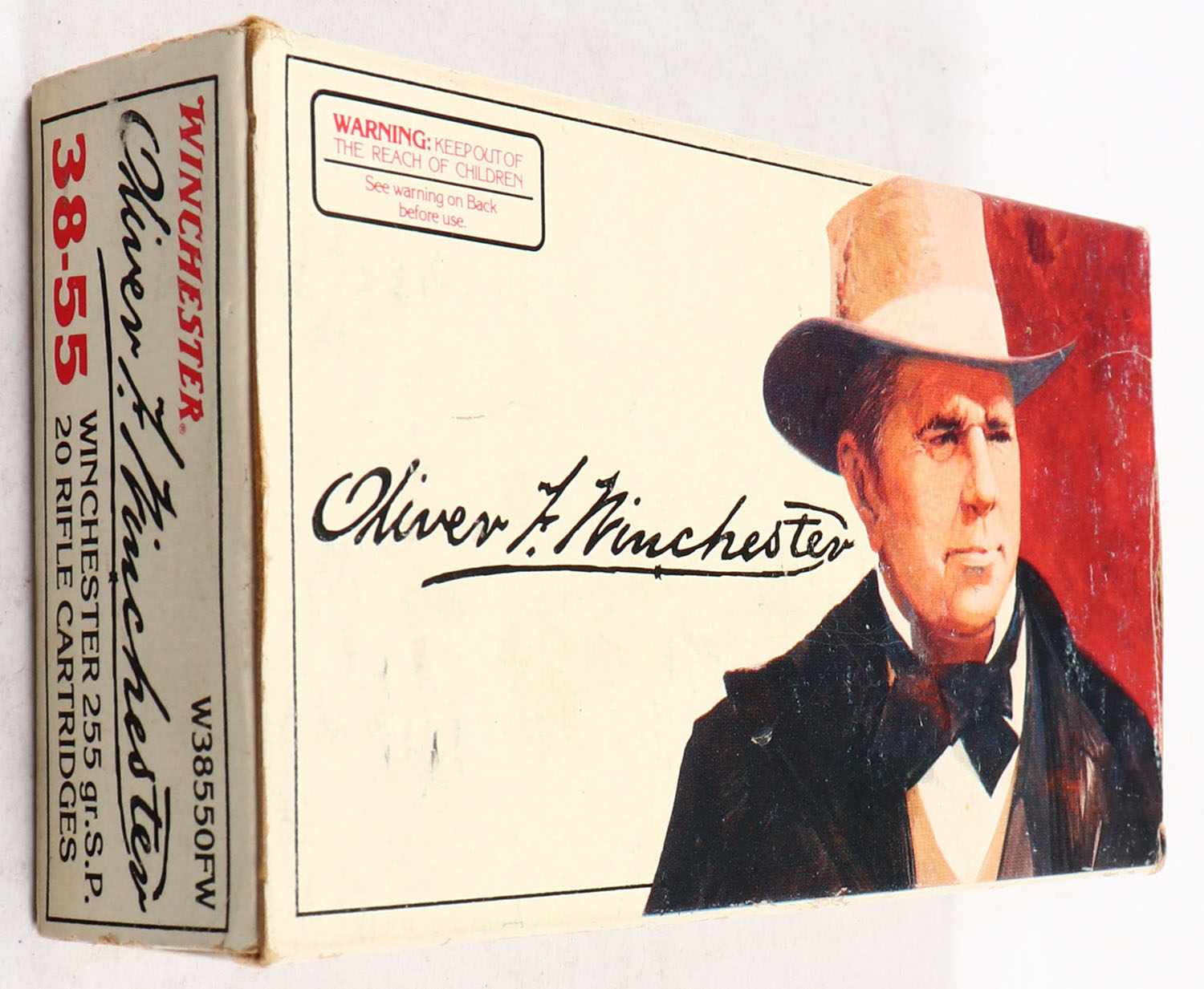 Winchester, Oliver F. Winchester, .38-55 Winchester, 255 Grain Soft Point, Full, 1pc. White box picturing Oliver Winchester, box is solid with excellent color, minor shelf wear with light scuffing, corners are mostly sharp, edges are crisp, end flaps are solid, ammo is excellent. Grade: Excellent - Value: 30 to 90