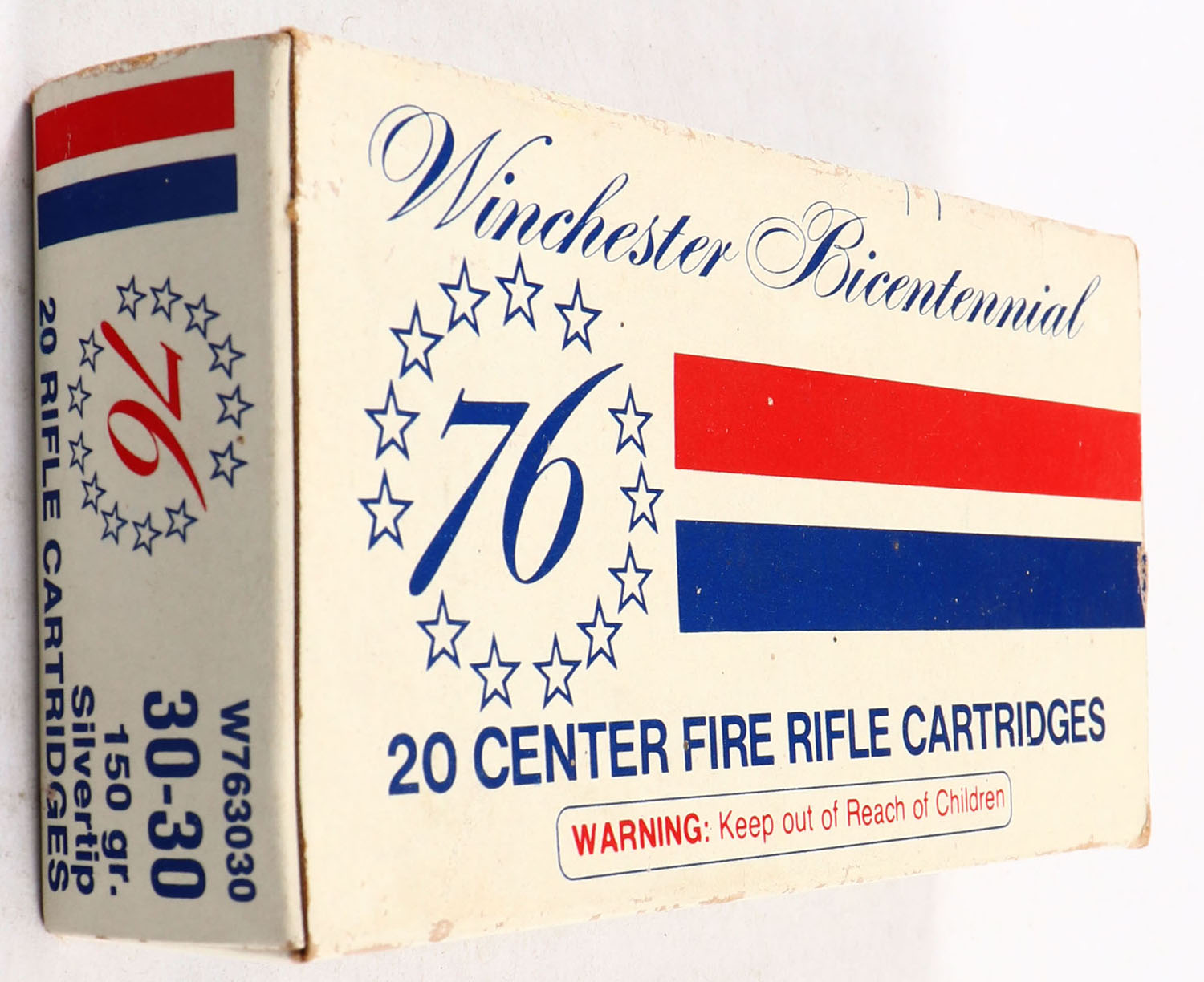 Winchester, Bicentennial, .30-30 Winchester, 150 Grain Silvertip, Full, 1pc. White blue & red box, box is solid with excellent color, box has shelf & corner wear, edges are crisp, end flaps are solid, ammo is minty. Grade: Excellent - Value: 20 to 60