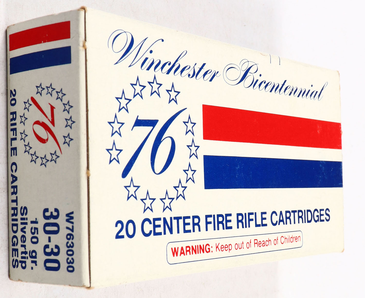 Winchester, Bicentennial, .30-30 Winchester, 150 Grain Silvertip, Full, 1pc. White blue & red box, box is solid with excellent color, very minor shelf wear, edges are crisp, end flaps are solid, ammo is minty. Grade: Excellent ++ - Value: 20 to 60