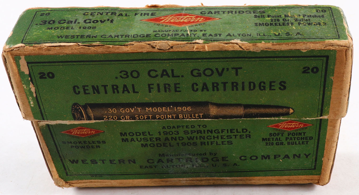 Western, .30 Cal Gov't Model 1906 (30-06), Smokeless Powder, 220 Gr. Soft point metal patched Bullet, 2pc, Full, buff box with green label & black/red print, box is solid with rub marks, edge wear, & seam split to top box, ammo is very good. Grade: Very Good - Value: 50 to 150
