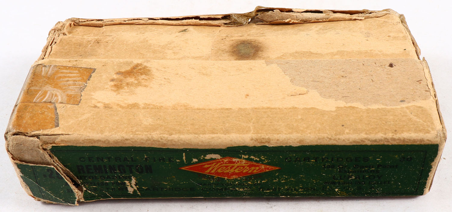 Western, .25 Remington Autoloading, 100 Gr. Open Point Expanding LUBALOY Bullet, smokeless, 2pc, Full of mixed manufactures, buff box with green label & black/red print, box has soiling with edge & corner wear, has tape repairs to bottom, ammo is good. Grade: Good + - Value: 30 to 120