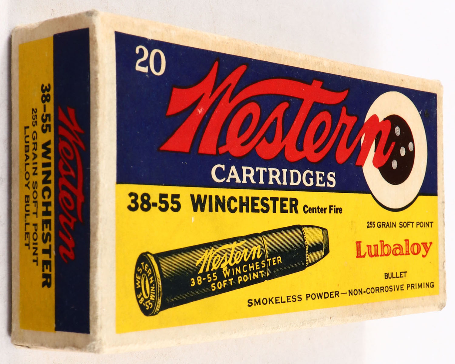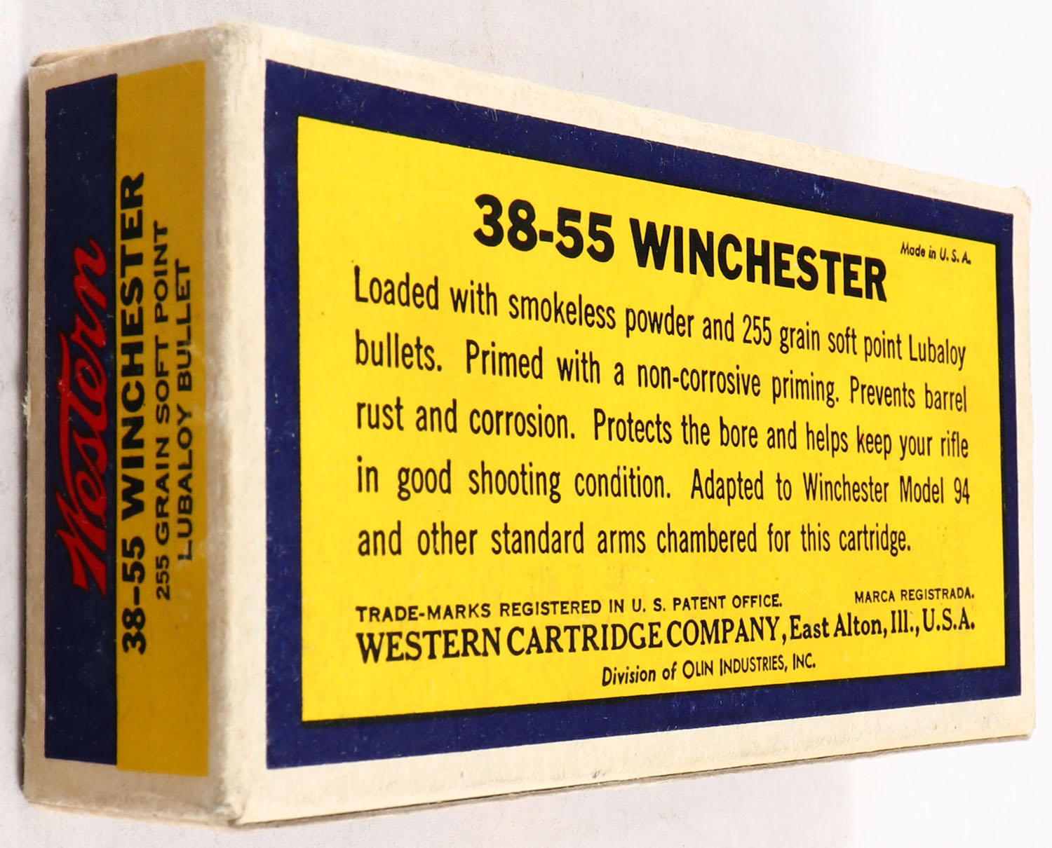 Western, .38-55 Winchester, 255 Gr. Soft Point, Lubaloy, Full, 1pc. Yellow blue & red box, box is solid with excellent color, very minor age soiling & corner wear, edges are mostly crisp, end flaps are solid, ammo is minty. Grade: Excellent ++ - Value: 40 to 120