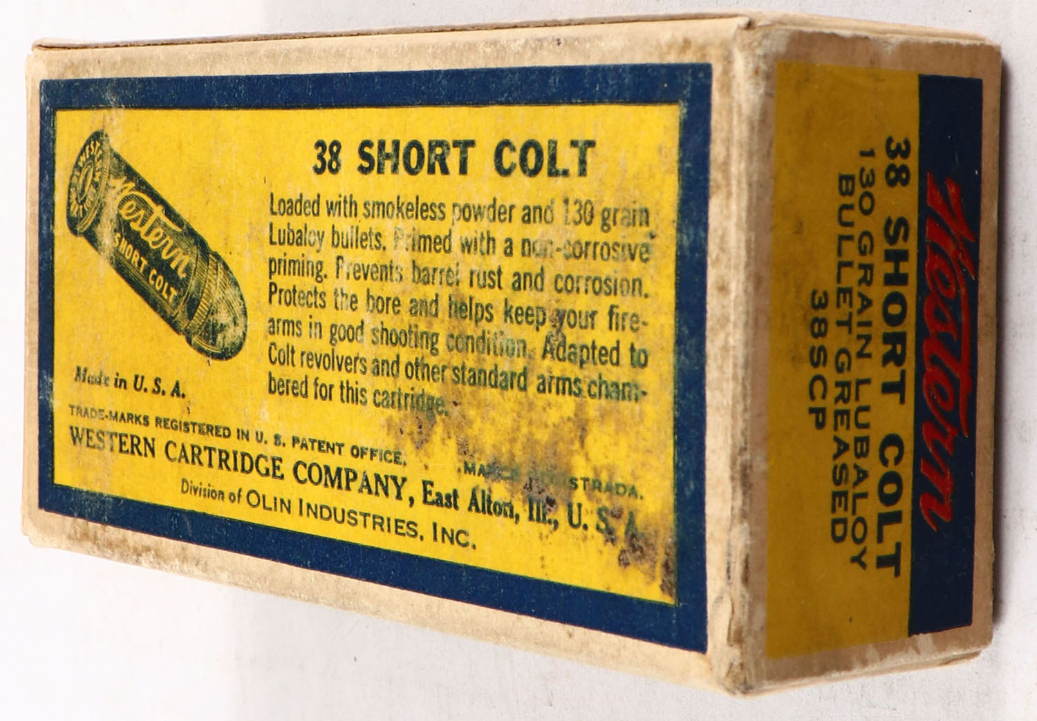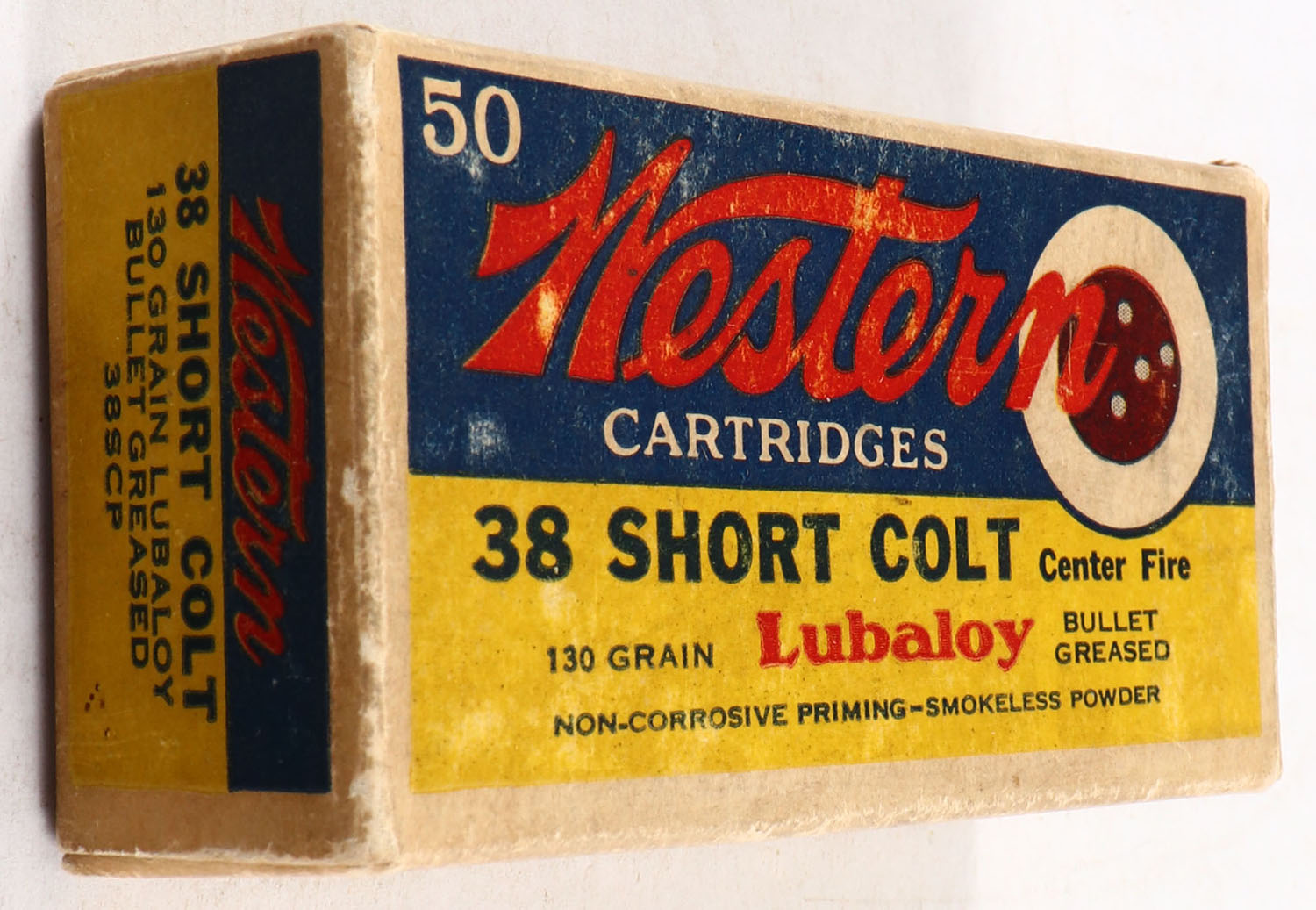 Western, .38 Short Colt, 130 Grain Lubaloy Bullet, Full, 1Pc., Blue yellow & red bulls eye box, box is solid with very good color, some age soiling & shelf wear, very minor edge & corner wear, end flaps are solid, ammo is excellent. Grade: Very Good ++ - Value: 30 to 90