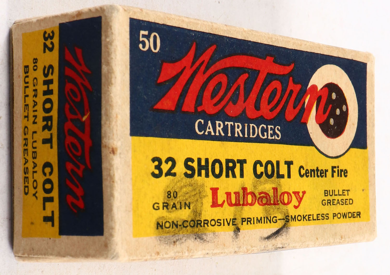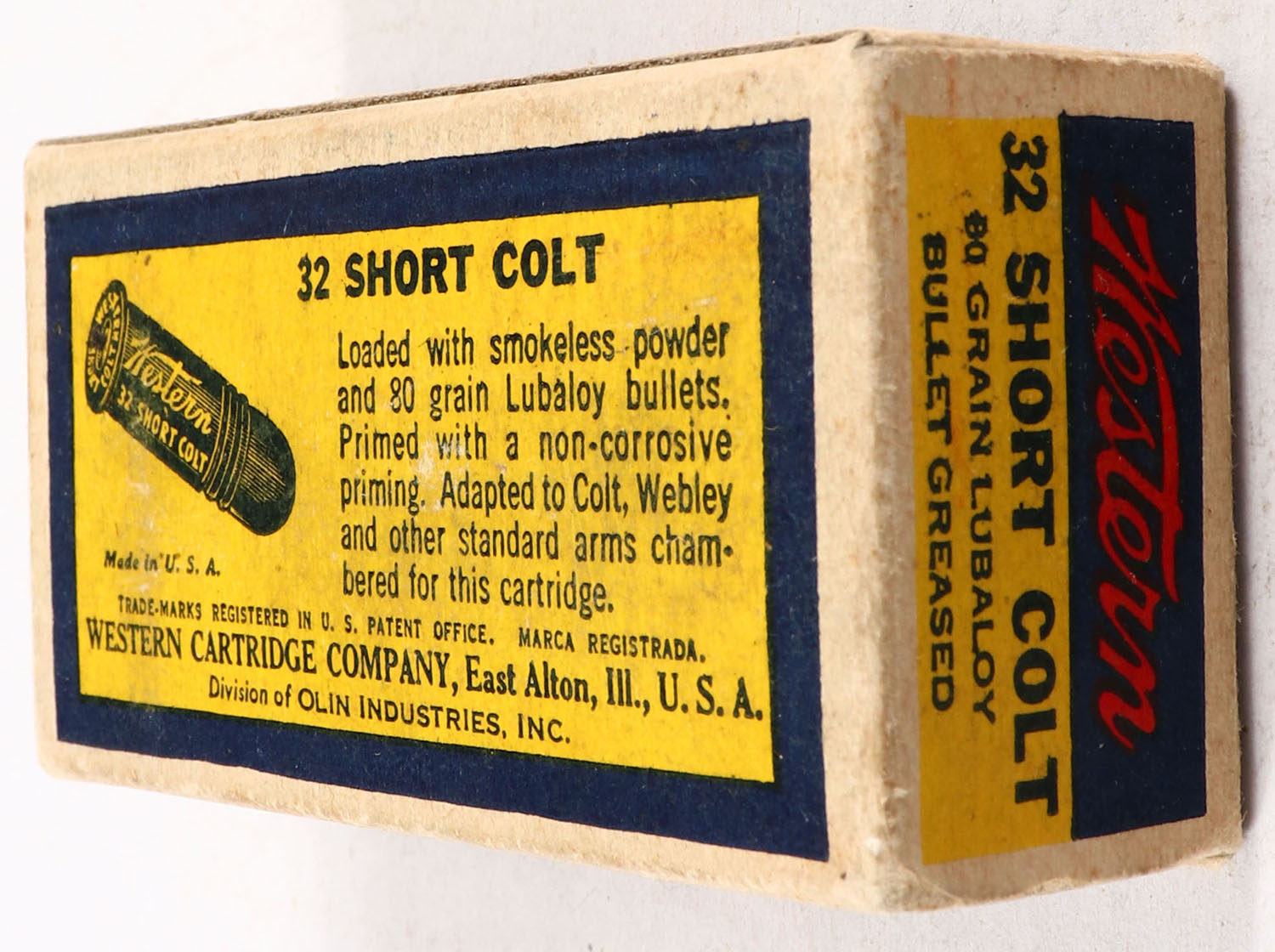 Western, .32 Short Colt, 80 Grain Lubaloy Bullet, Full, 1pc. Blue yellow & red bulls eye box, box is solid with very good color, some age soiling, minor edge & corner wear, top has been written on, end flaps are solid ammo is excellent. Grade: Very Good ++ - Value: 30 to 90