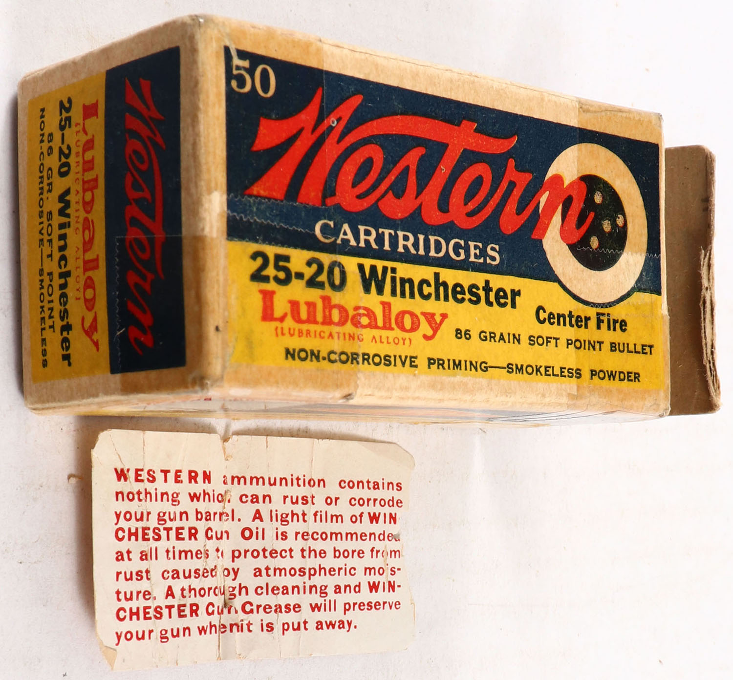 Western, Bullseye box, .25-20 Winchester, 86 Gr. Soft Point, Lubaloy, Full with insert, 1pc. Yellow blue & red bulls eye box, box is solid with very good to excellent color, insert tab of right end flap is missing, box has tape on all sides, minor edge & corner wear, left end flap is solid, insert is good, ammo is excellent. Grade: Very Good - Value: 40 to 120