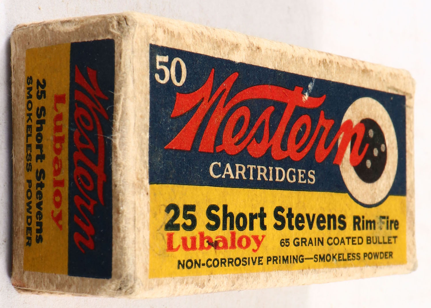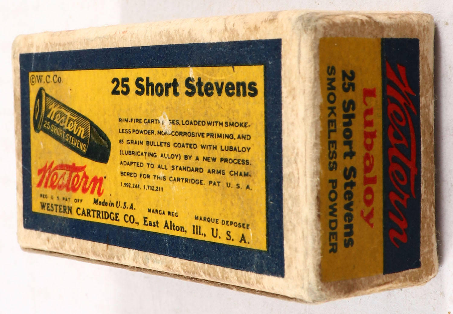 Western, .25 Short Stevens, 65 Grain Lubaloy Bullet, Full, 1Pc., Blue yellow & red bulls eye box, box is solid very good color, some age soiling, minor edge & corner wear, end flaps are solid, ammo is excellent. Grade: Very Good++ - Value: 40 to 120