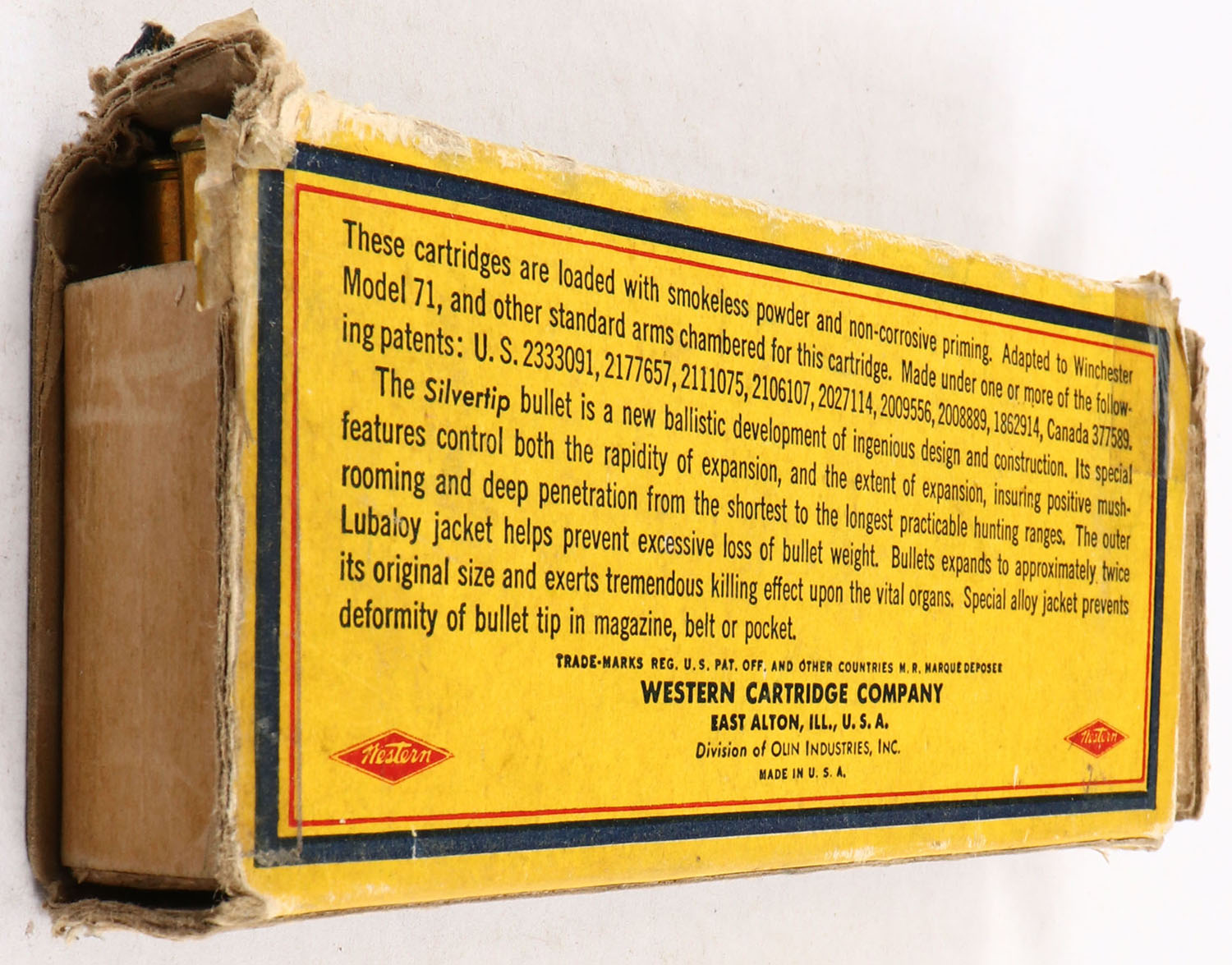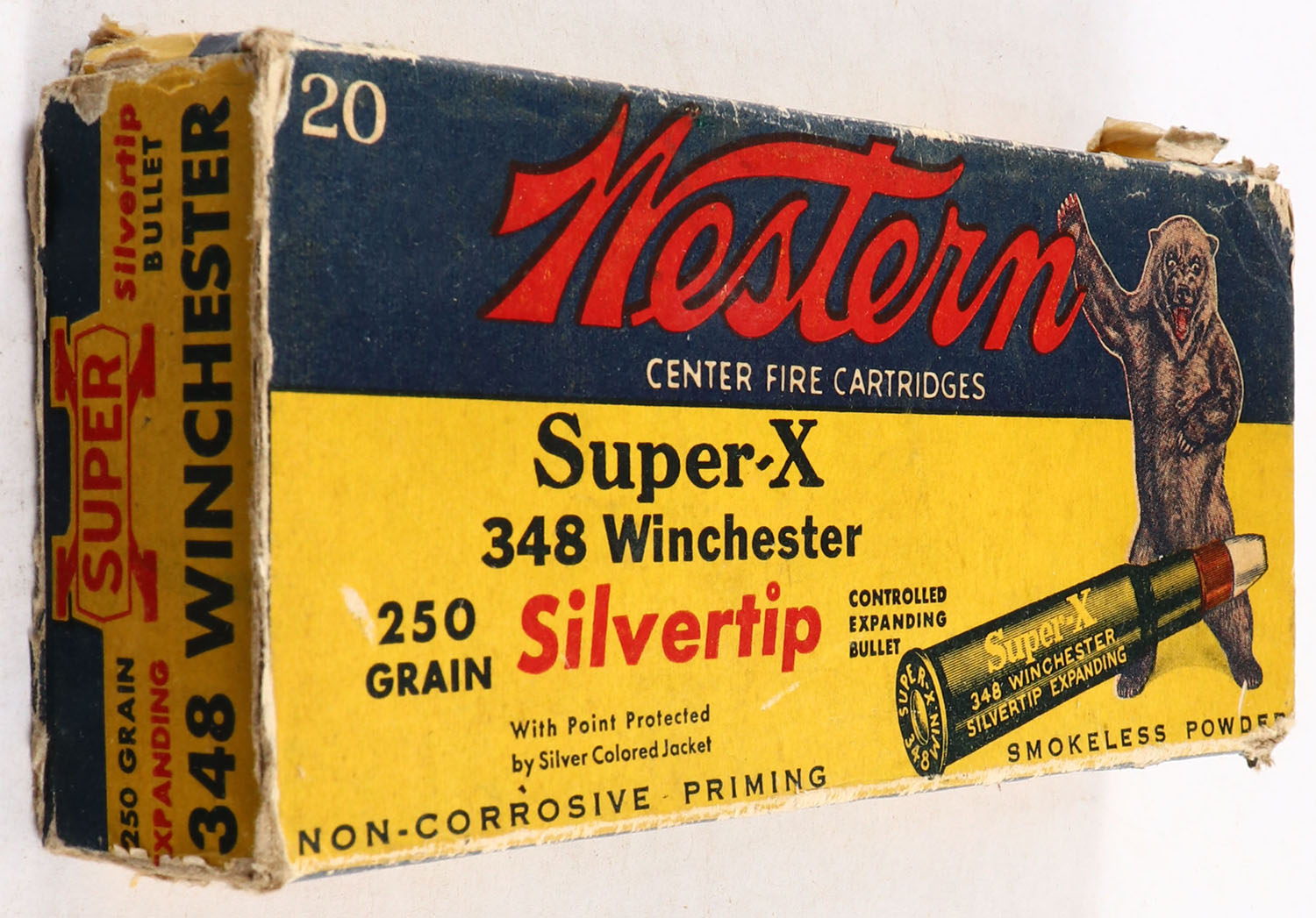 Western, Silvertip, .348 Winchester, 250 Grain Controlled Expanding Bullet, Full, 1pc. Yellow blue & red bear box, both end flaps are torn, one end flap is missing, very good color, some age soiling, corner wear, some edge wear, ammo is excellent. Grade: Fair ++ - Value: 30 to 90