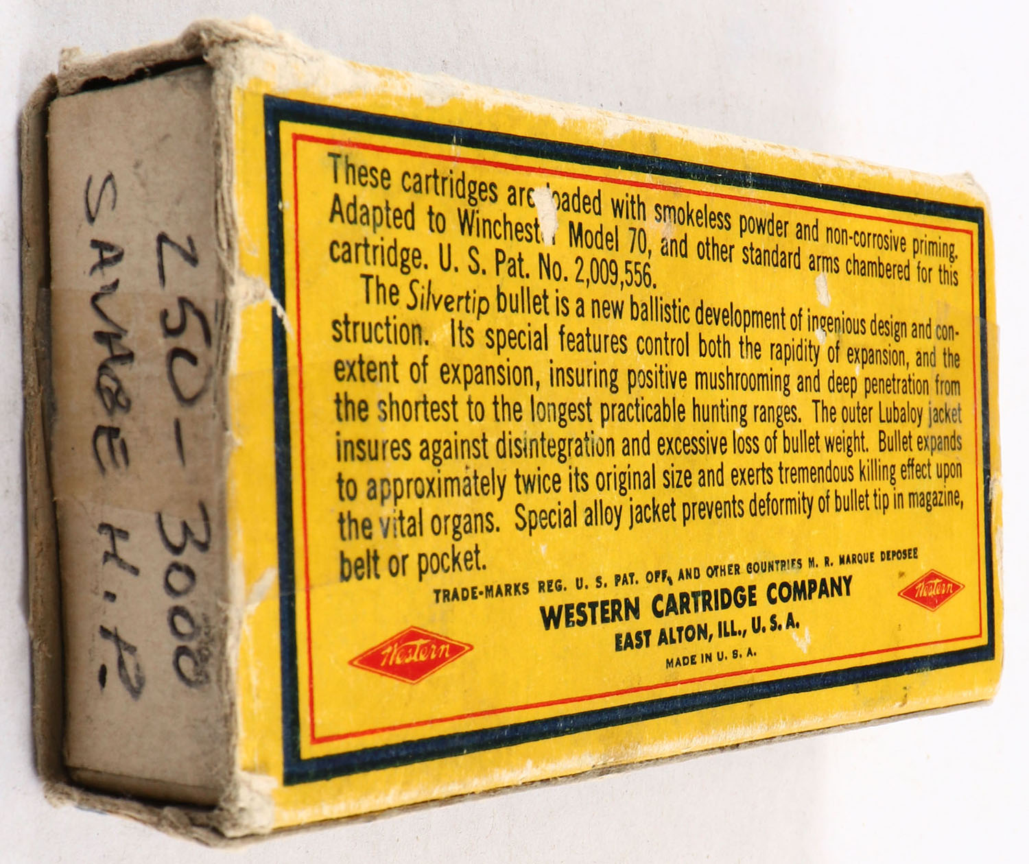 Western, Silvertip, 250-3000 Savage H.P., 100 Grain Controlled Expanding Bullet, Full of incorrect ammo, box is missing both end flaps very good to excellent color, minor age soiling, shelf wear, edge & corner wear, ammo is excellent. Grade: Fair ++ - Value: 8 to 40