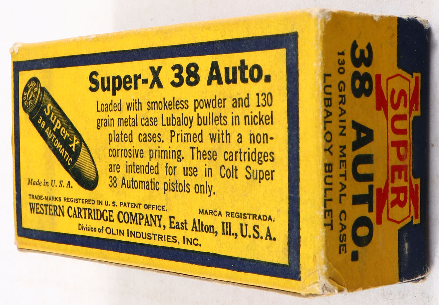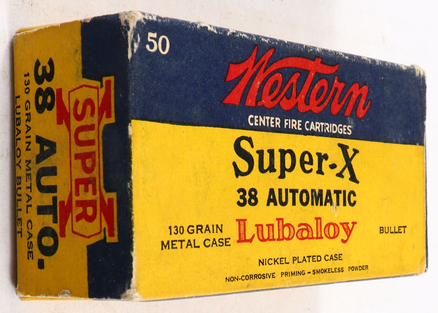Western, Super-X, 38 Automatic, 130 Grain Metal Case Bullet, Full, 1pc. Yellow blue & red box, box is solid with excellent color, some shelf & corner wear, very minor edge wear, end flaps are solid, ammo is very good to excellent. Grade: Very Good ++ - Value: 20 to 60
