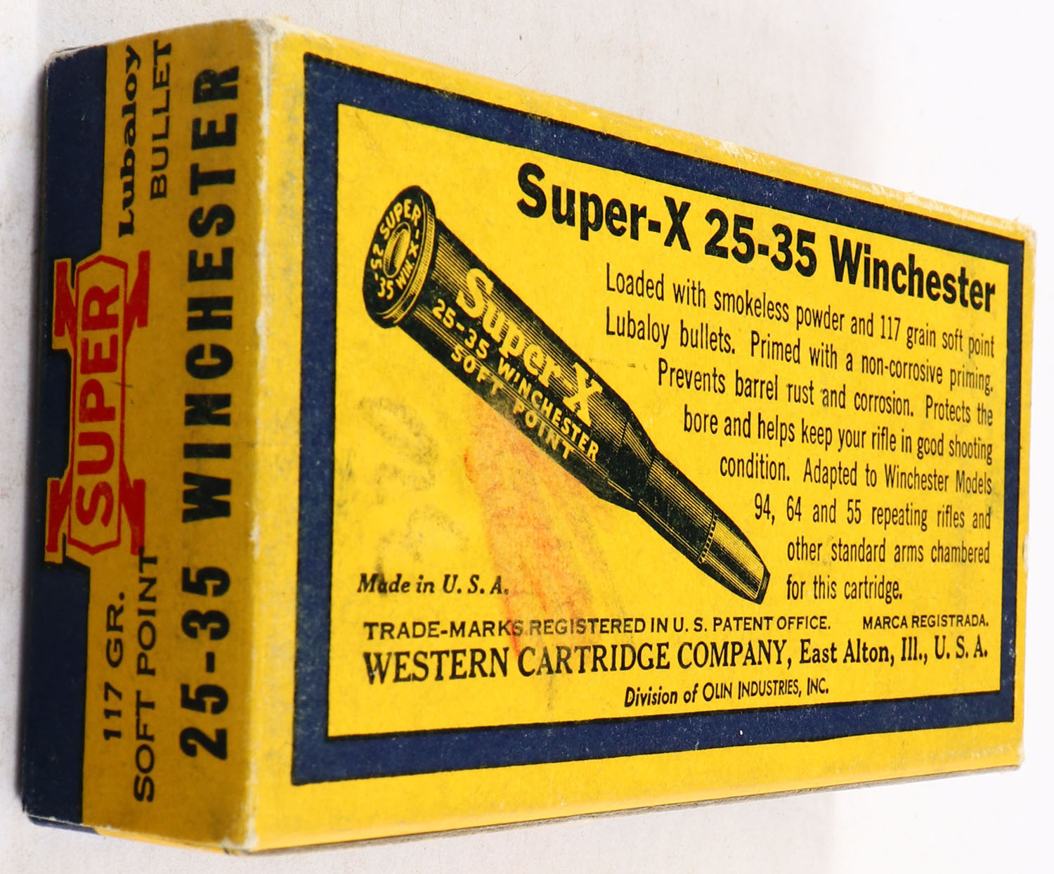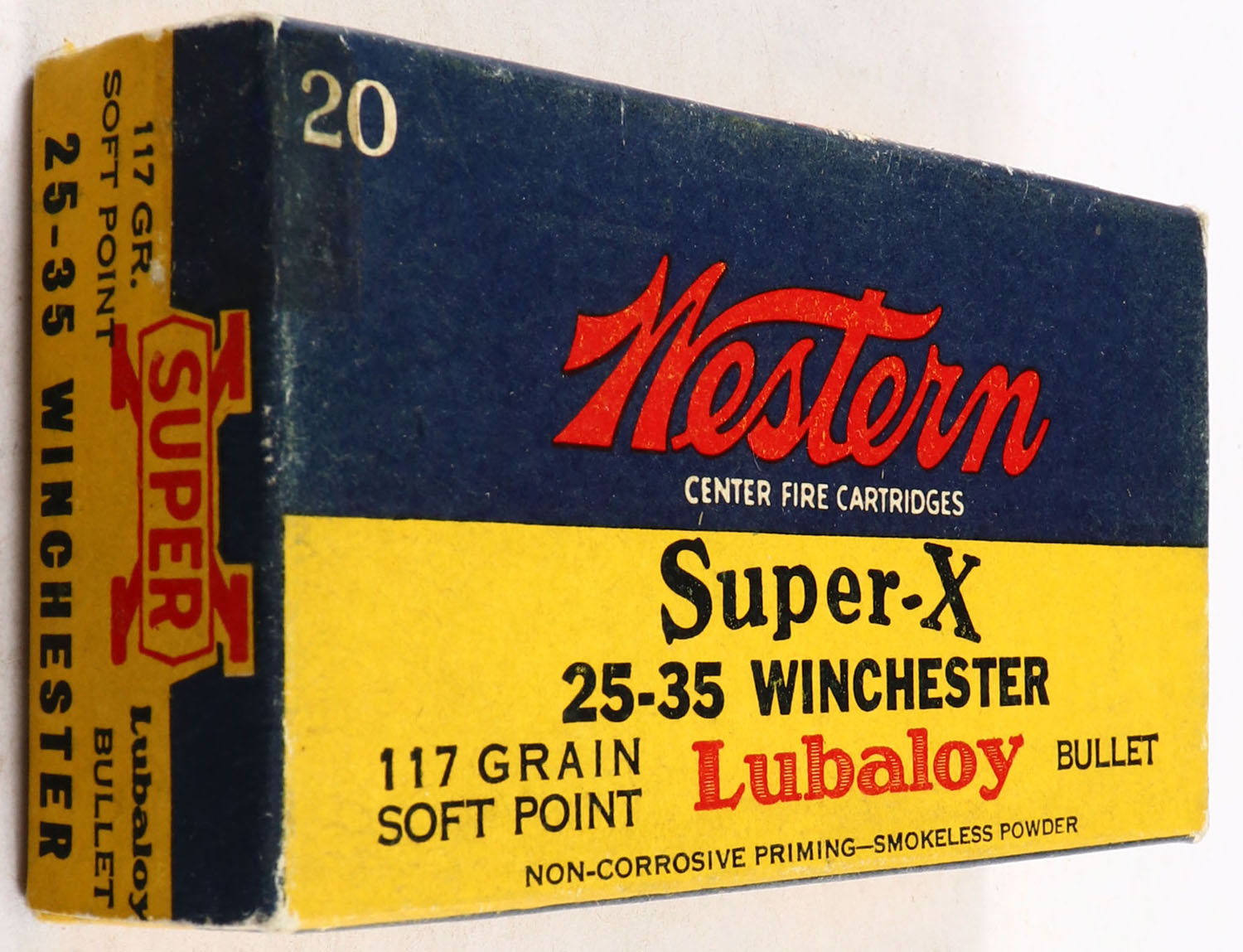 Western, Super-X, .25-35 Winchester, 117 Grain Soft Point Bullet, Full, 1pc. Yellow blue & red box, box is solid with very good to excellent color, minor shelf & corner wear, edges are mostly crisp, end flaps are solid, ammo is excellent. Grade: Excellent + - Value: 50 to 200