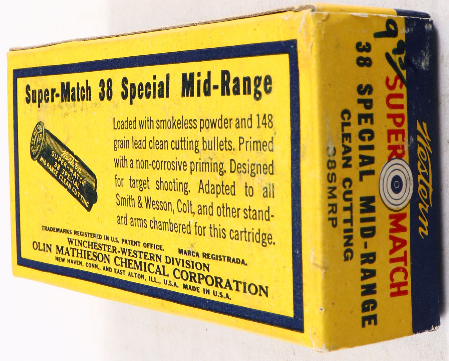 Western, Super Match, .38 Special Mid-Range, 148 Grain Lead Clean Cutting Bullet, Full, 1pc. Yellow blue & red box, box is solid with excellent color, has very minor edge & corner wear, end flaps are solid, ammo is excellent. Grade: Excellent + - Value: 16 to 60