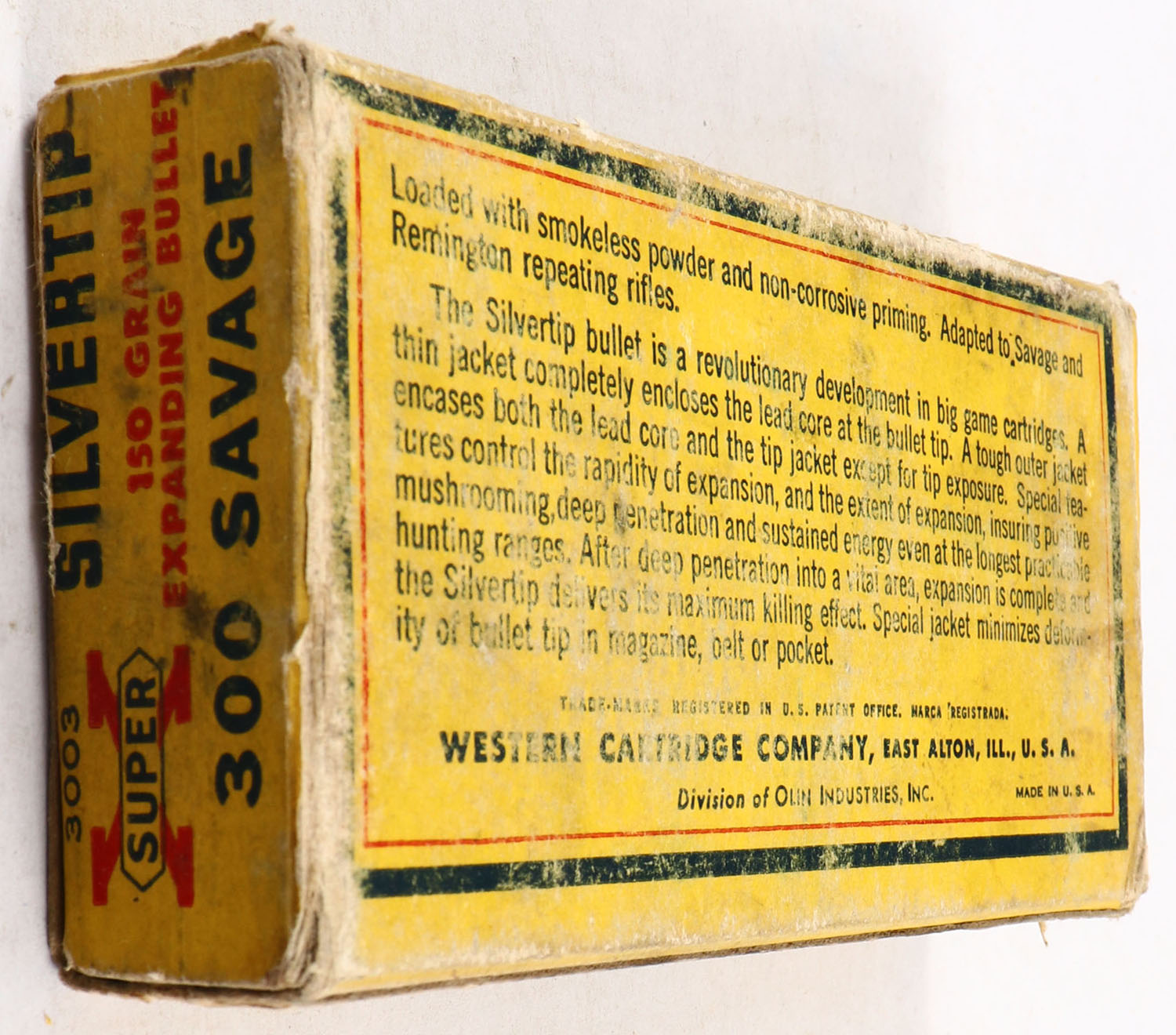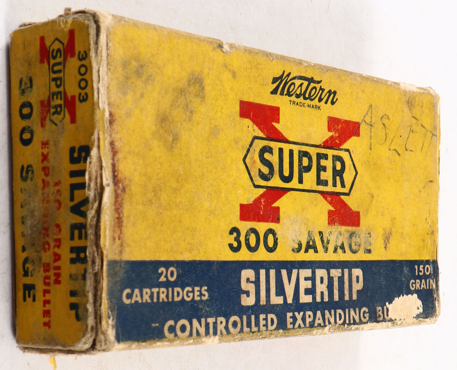 Western, Silvertip, .300 Savage, 150 Grain Controlled Expanding Bullet, Partial 17rds., 1pc. Yellow blue & red box, box is solid with good color, age soiling, shelf wear, edge & corner wear, top has been written on, end flaps are mostly solid, ammo is very good to excellent. Grade: Good + - Value: 16 to 60