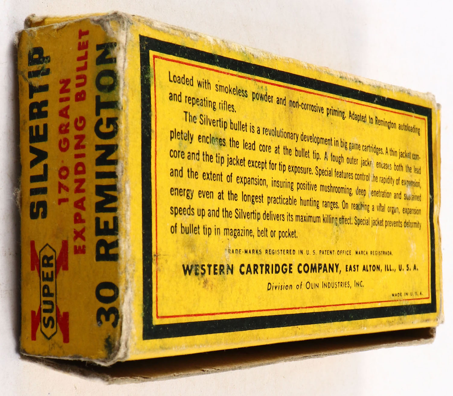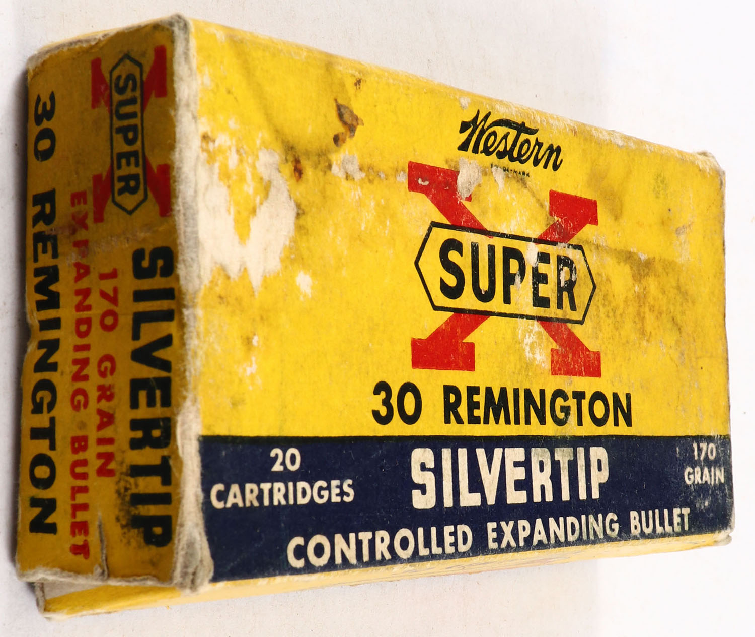 Western, Super X Silvertip, .30 Remington, 170 Grain Controlled Expanding Bullet, Full, 1pc. Yellow blue & red box, box is solid with good color, some age soiling, factory seam has unadhered, shelf & corner wear, minor edge wear, end flaps are solid, ammo is very good. Grade: Good + - Value: 20 to 80