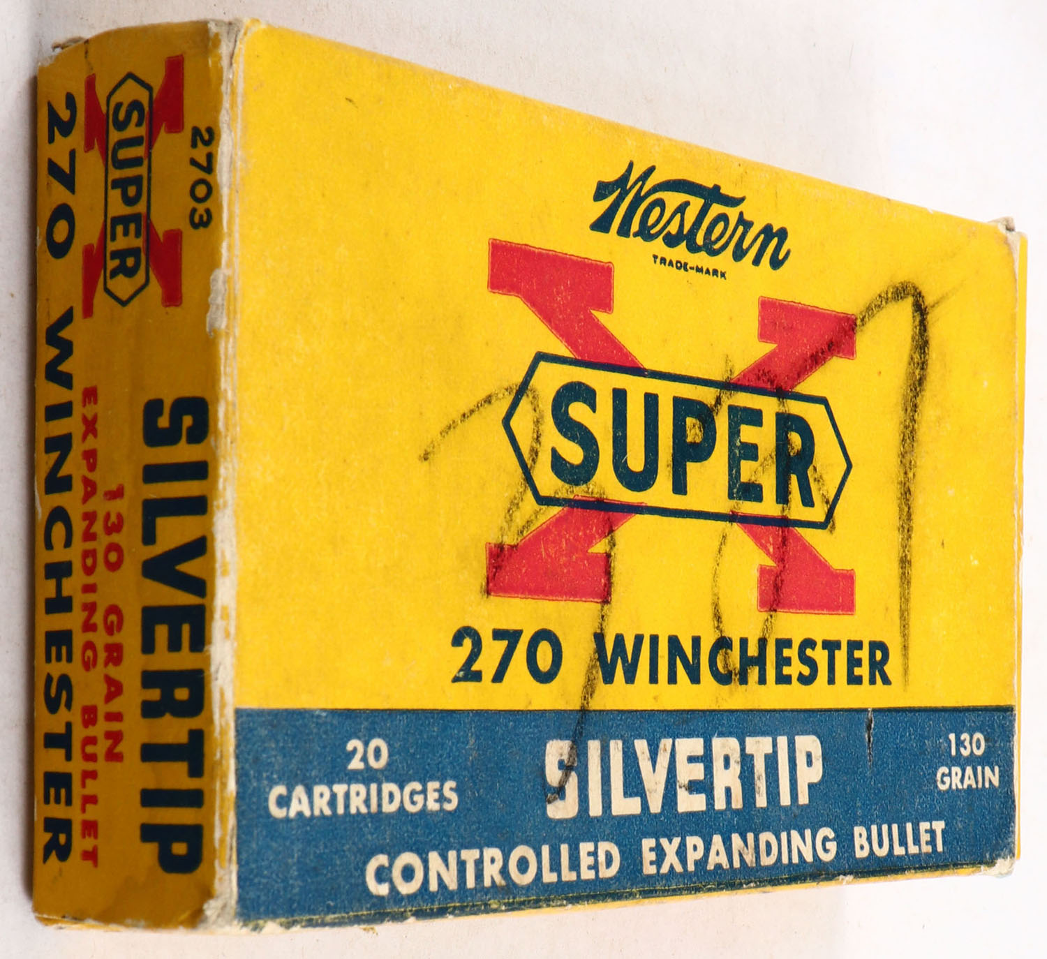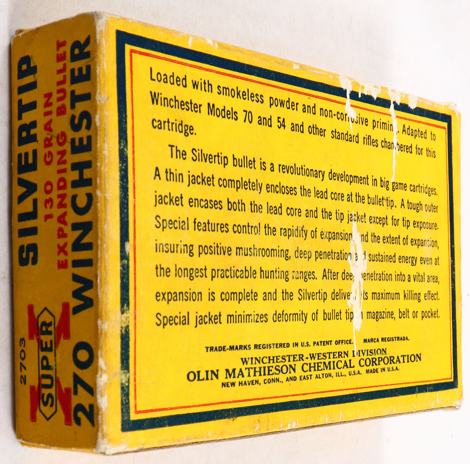 Western, Super-X Silvertip, .270 Winchester, 130 Grain Controlled Expanding Bullet, Partial 19rds. 15 being correct, 1pc. Yellow blue & red box, box has very good color, minor age soiling & scuffing, very minor edge wear, top has been written on flaps are solid, ammo is very good. Grade: Very Good - Value: 10 to 40