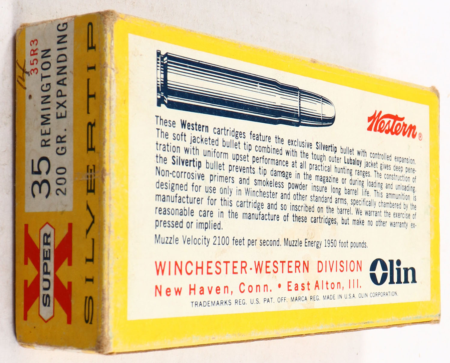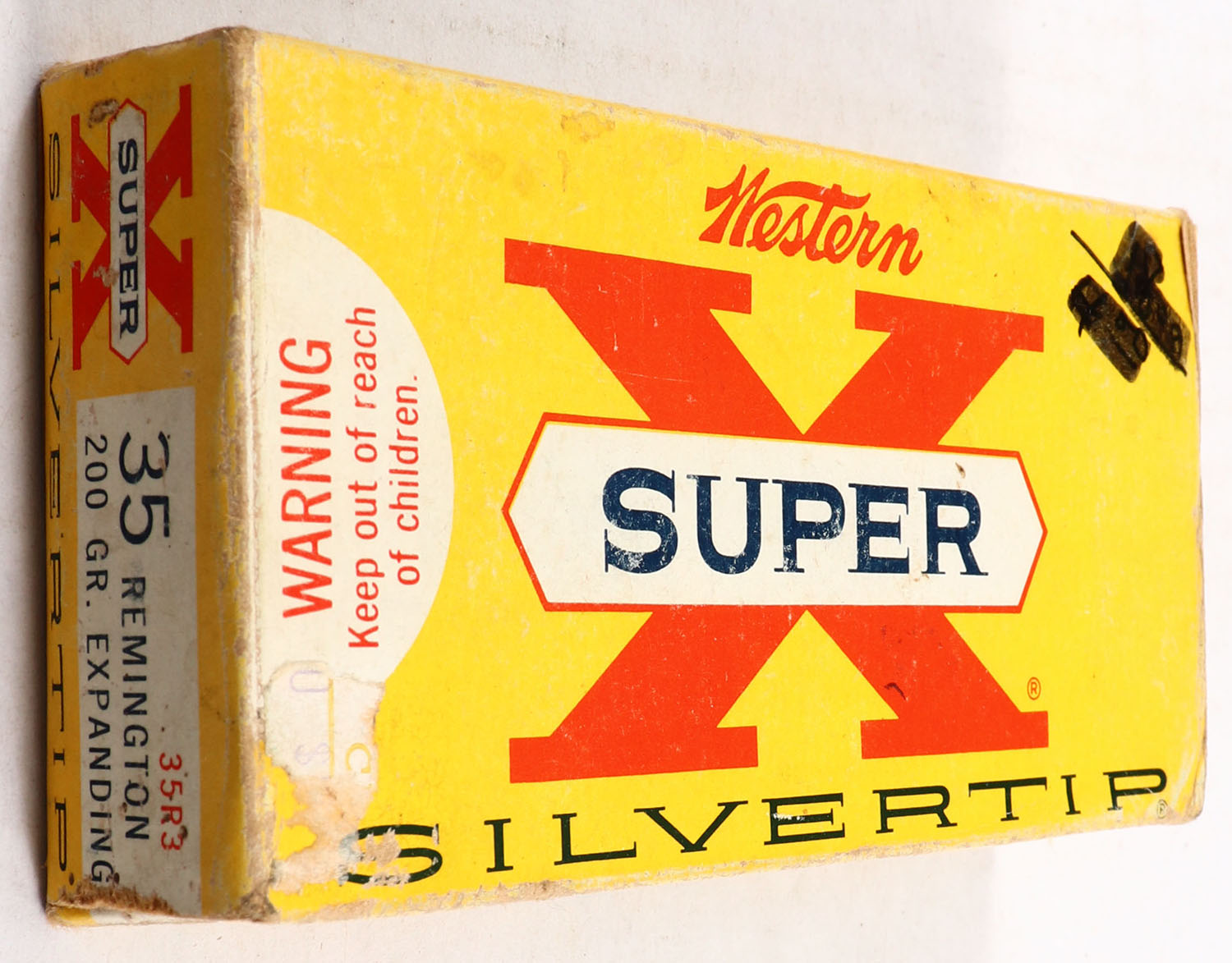 Western, Super X Silvertip, .35 Remington, 200 Grain Expanding Bullet, Full, 1pc. Yellow white & red box, box is solid with good color, minor age soiling & shelf wear, has edge & corner wear, writing on top, end flaps are solid, ammo is excellent. Grade: Very Good ++ - Value: 30 to 90