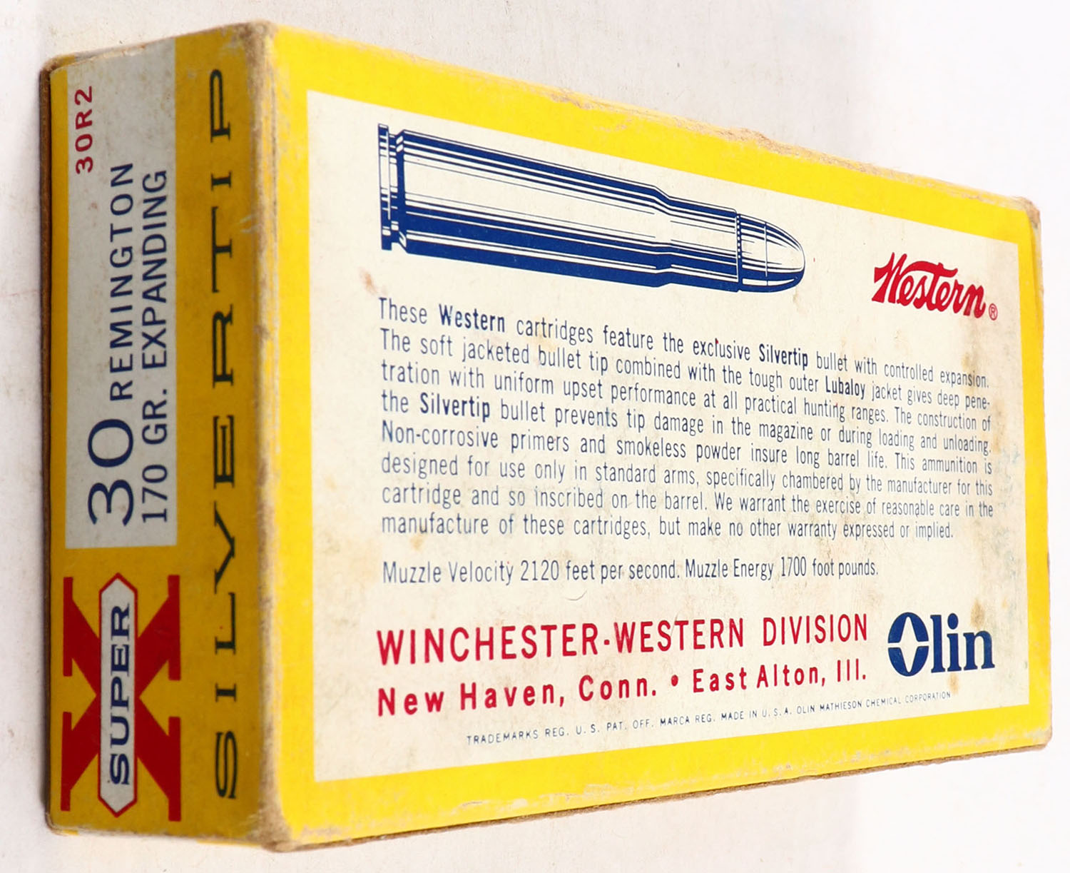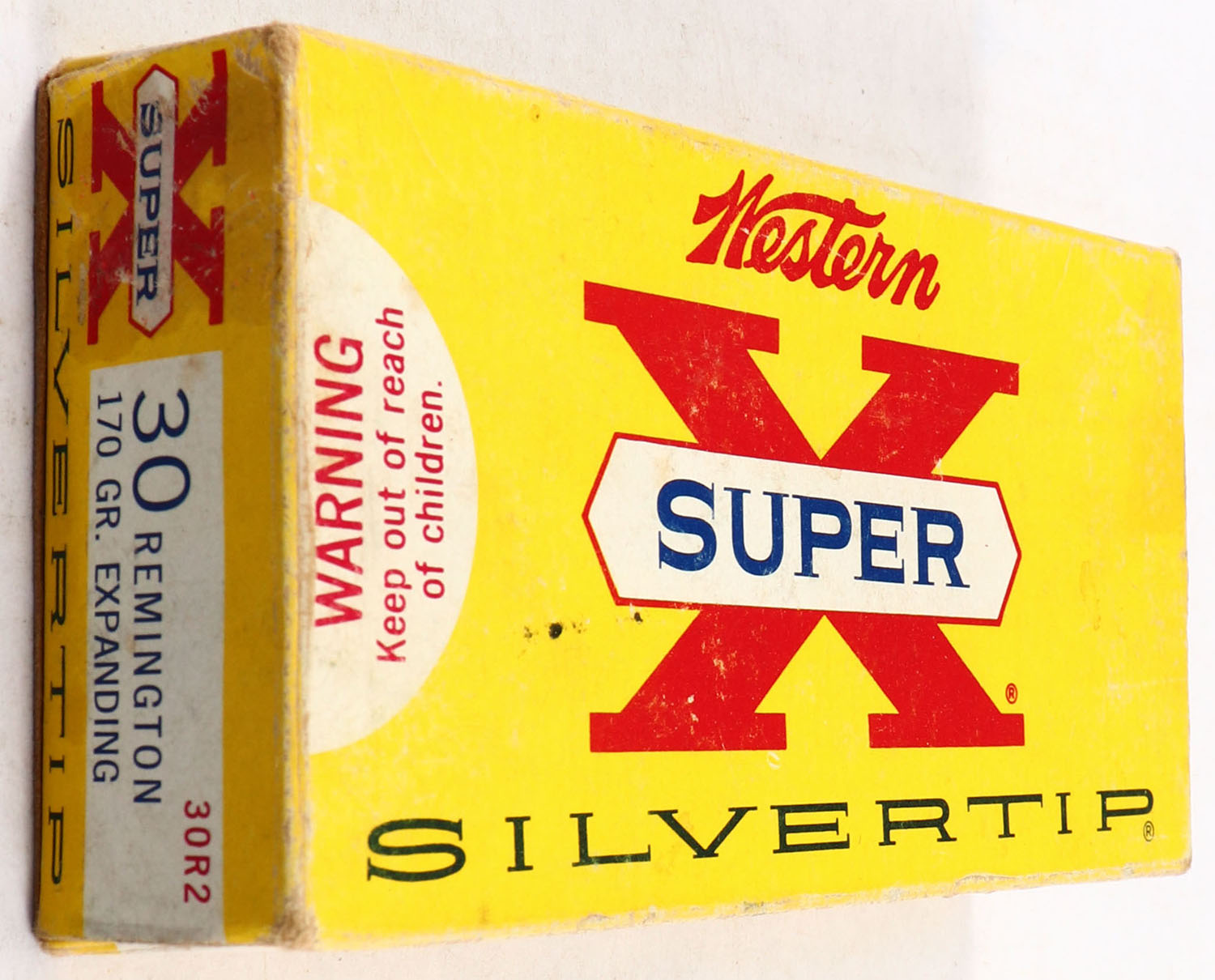 Western, Super X Silvertip, .30 Remington, 170 Grain Expanding Bullet, Full, 1pc. Yellow white & red box, box is solid with excellent color, minor age soiling & shelf wear, minor edge & corner wear, end flaps are solid, ammo is excellent. Grade: Very Good + - Value: 30 to 90