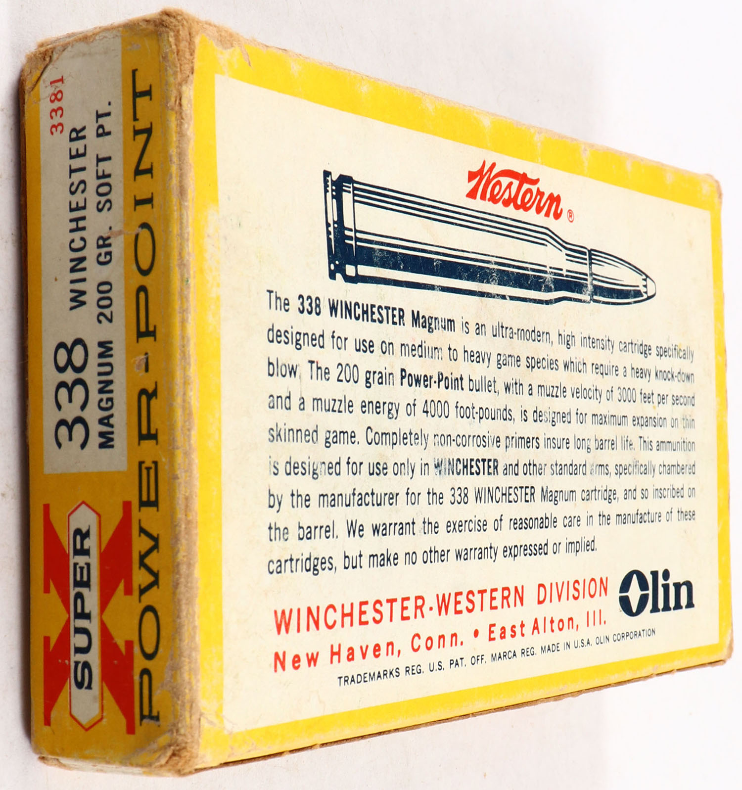 Western, Super X Power-Point, .338 Win. Magnum, 200 Gr. Soft Point, Full (15rds. Correct), 1pc. Yellow red & white box, box is solid with very good color, box has shelf wear & scuffing, corner & edgewear, end flaps are solid, ammo is excellent. Grade: Very Good + - Value: 20 to 80