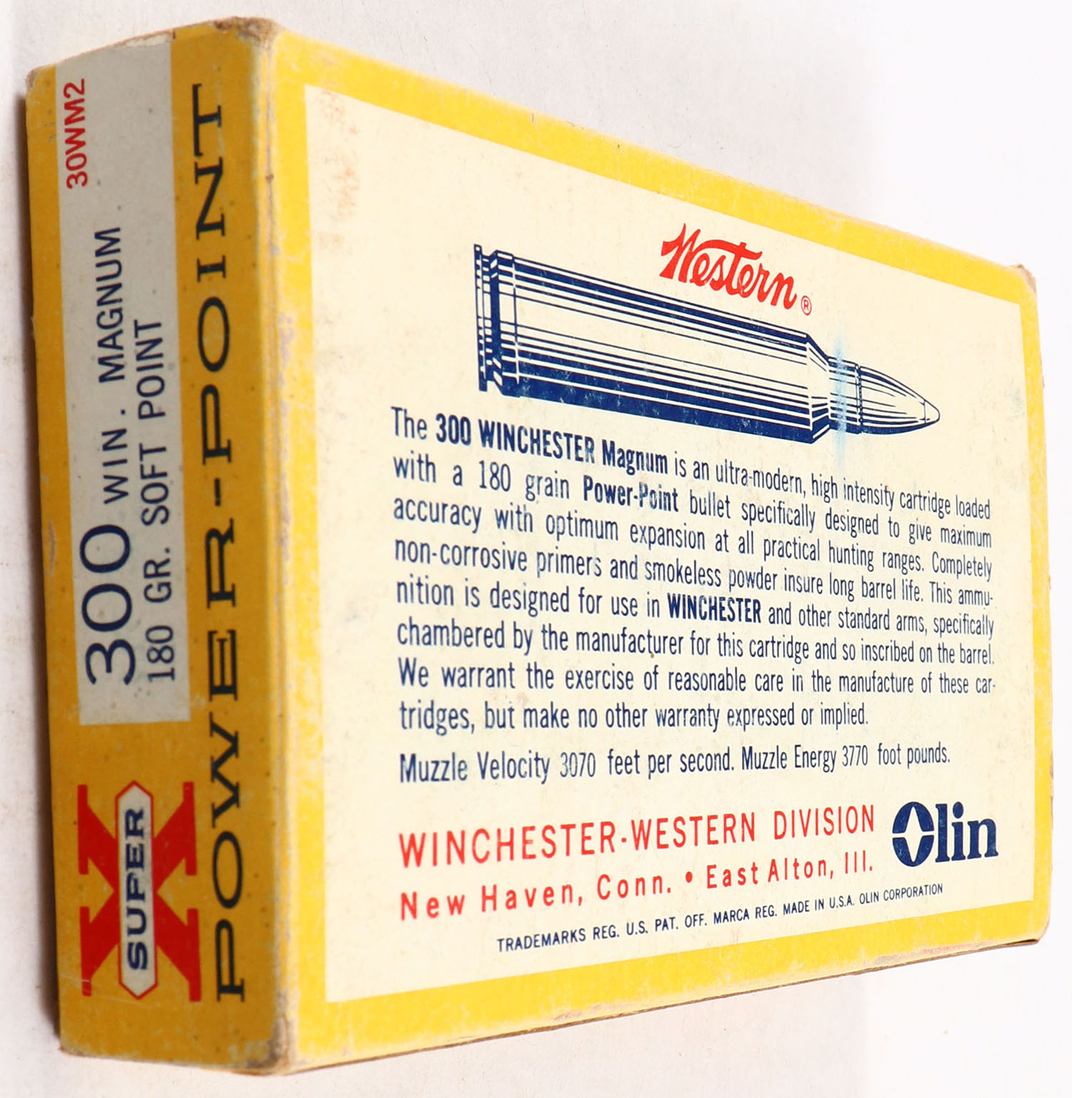 Western, Super X Power-Point, .300 Win. Magnum, 180 Gr. Soft Point, Full, 1pc. Yellow red & white box, box is solid with excellent color, has shelf wear, very minor corner wear, edges are mostly crisp, end flaps are solid, ammo is excellent. Grade: Excellent - Value: 20 to 60