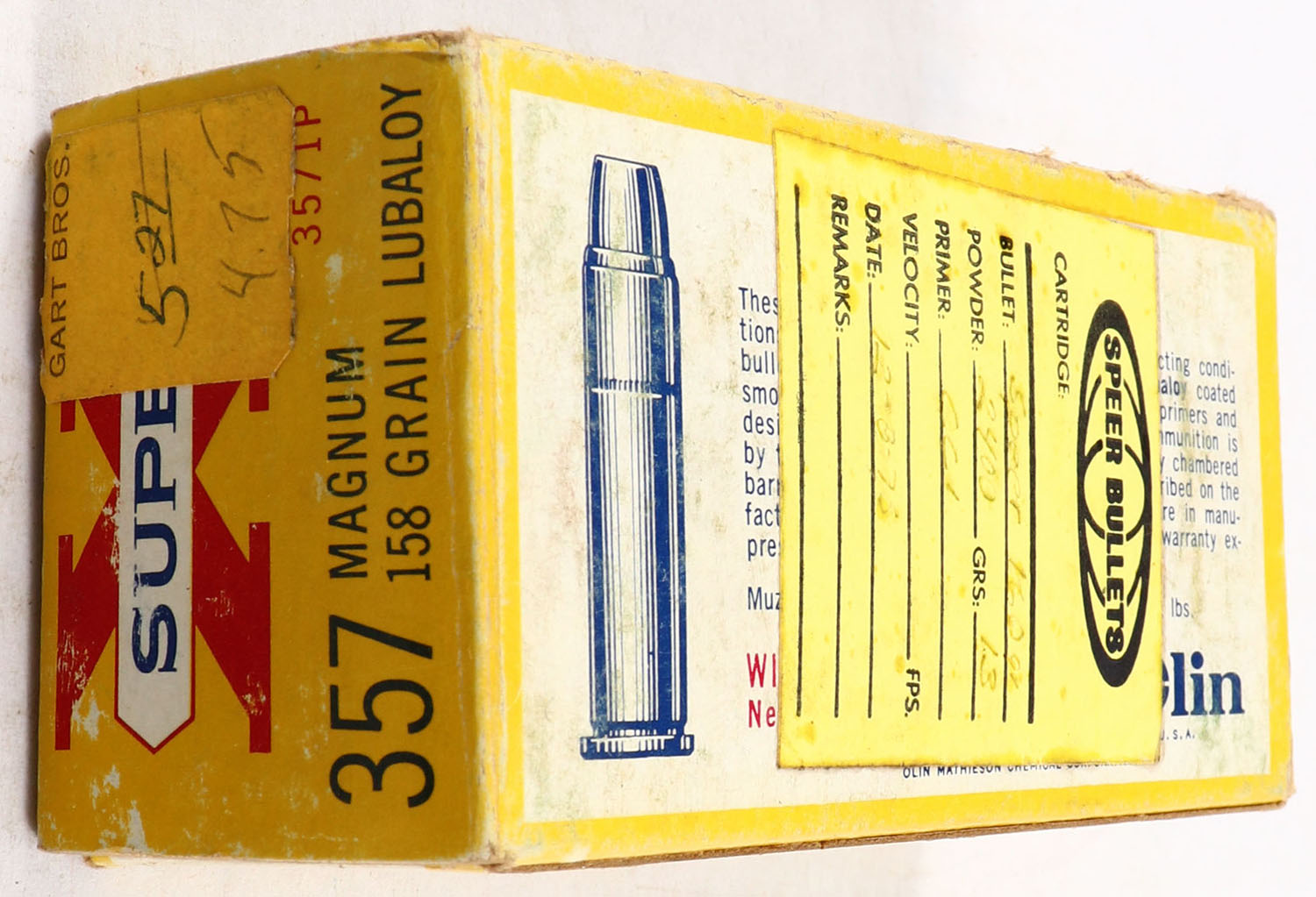 Western, Super-X, .357 Magnum, 158 Grain Lubaloy, Nickel Plated Case, Full, 1pc. Yellow white & red box, box is solid with very good color, minor age soiling, some shelf & corner wear, minor edge wear, end flaps are solid, ammo is excellent to minty. Grade: Very Good + - Value: 16 to 60