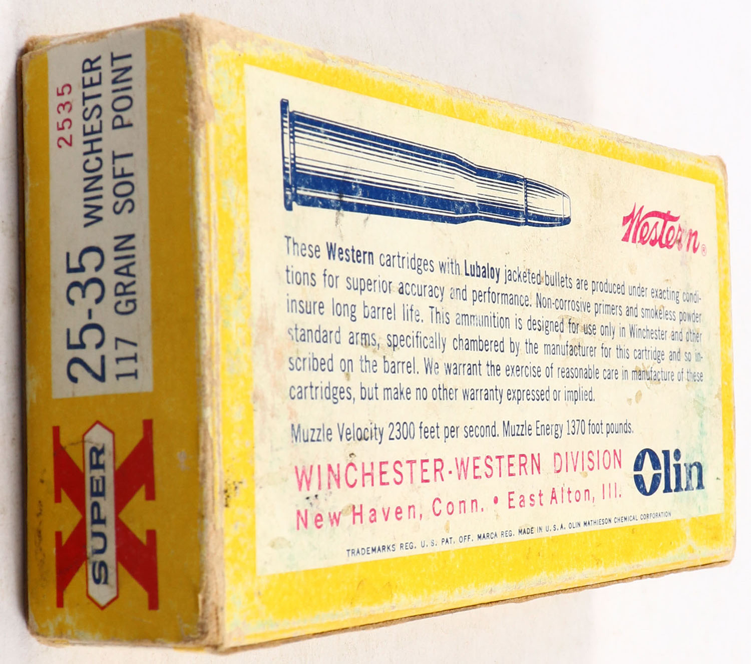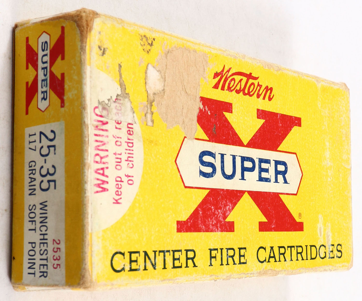 Western, Super-X, .25-35 Winchester, 117 Grain Soft Point, Full, 1pc. Yellow white & red box, box is solid with very good color, shelf wear, some edge & corner wear, end flaps are solid, ammo is excellent. Grade: Very Good - Value: 40 to 120