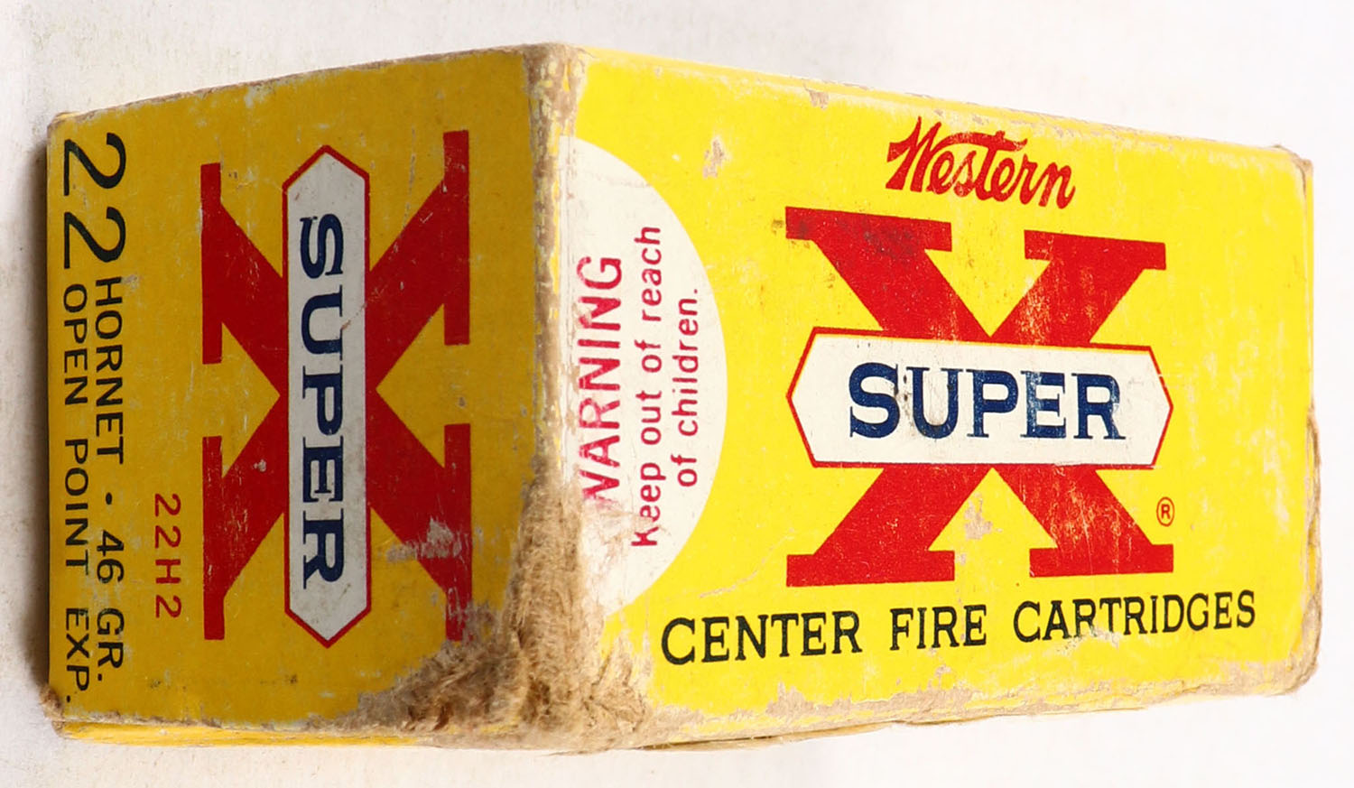Western, Super-X, 22 Hornet, Lubaloy Jacketed 46 Gr. Open Point, Full, 1pc. Yellow, blue, red & white box, box is solid with good color, shelf wear, corner & edge wear, end flaps are solid, ammo is excellent. Grade: Very Good - Value: 30 to 90