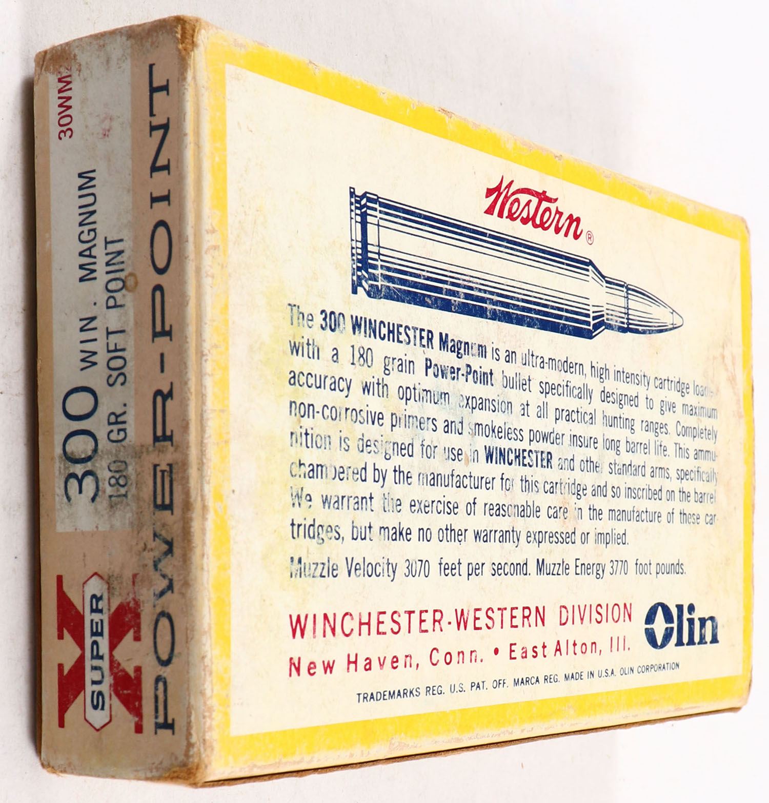 Western, Super-X Power-Point, .300 Winchester Magnum, 180 Gr. Soft Point, Full, 1pc. Yellow red & white box, box is solid with good color, has shelf wear & corner wear, some edge wear, end flaps are solid, ammo is good. Grade: Good ++ - Value: 20 to 60