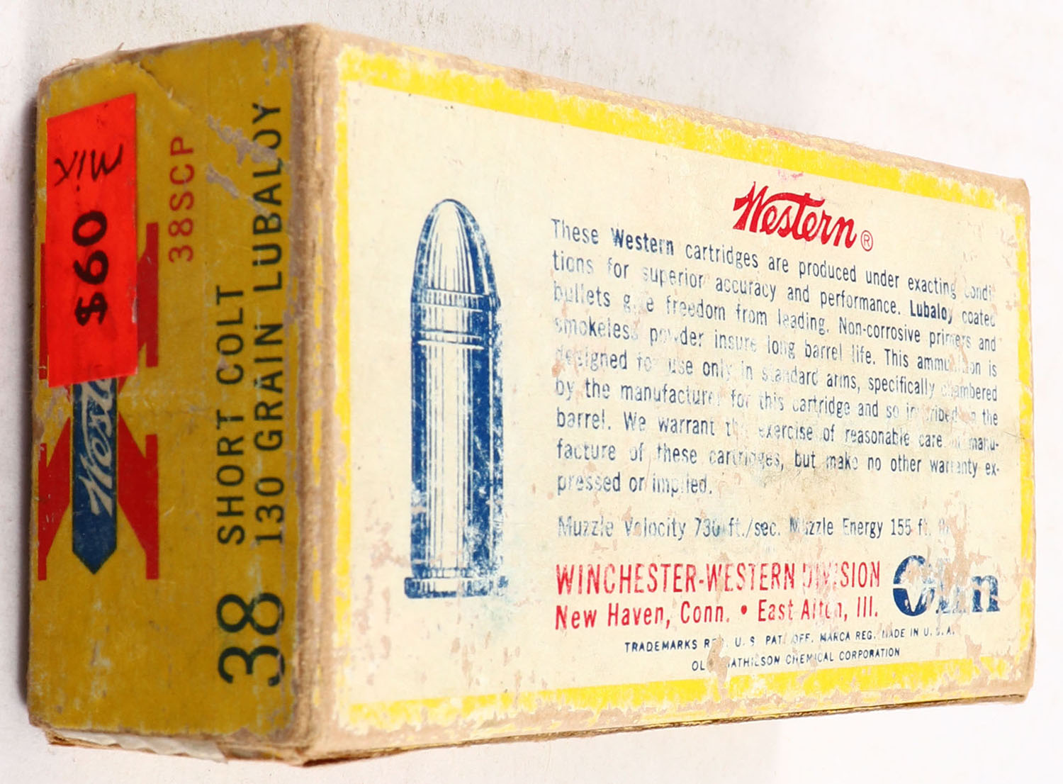 Western, X, .38 Short Colt, 130 Grain Lubaloy, Full of mixed H/S, 1pc. Yellow red & white box, box is solid with good color, shelf wear, some edge & corner wear, end flaps are solid, ammo is excellent. Grade: Very Good - Value: 20 to 60