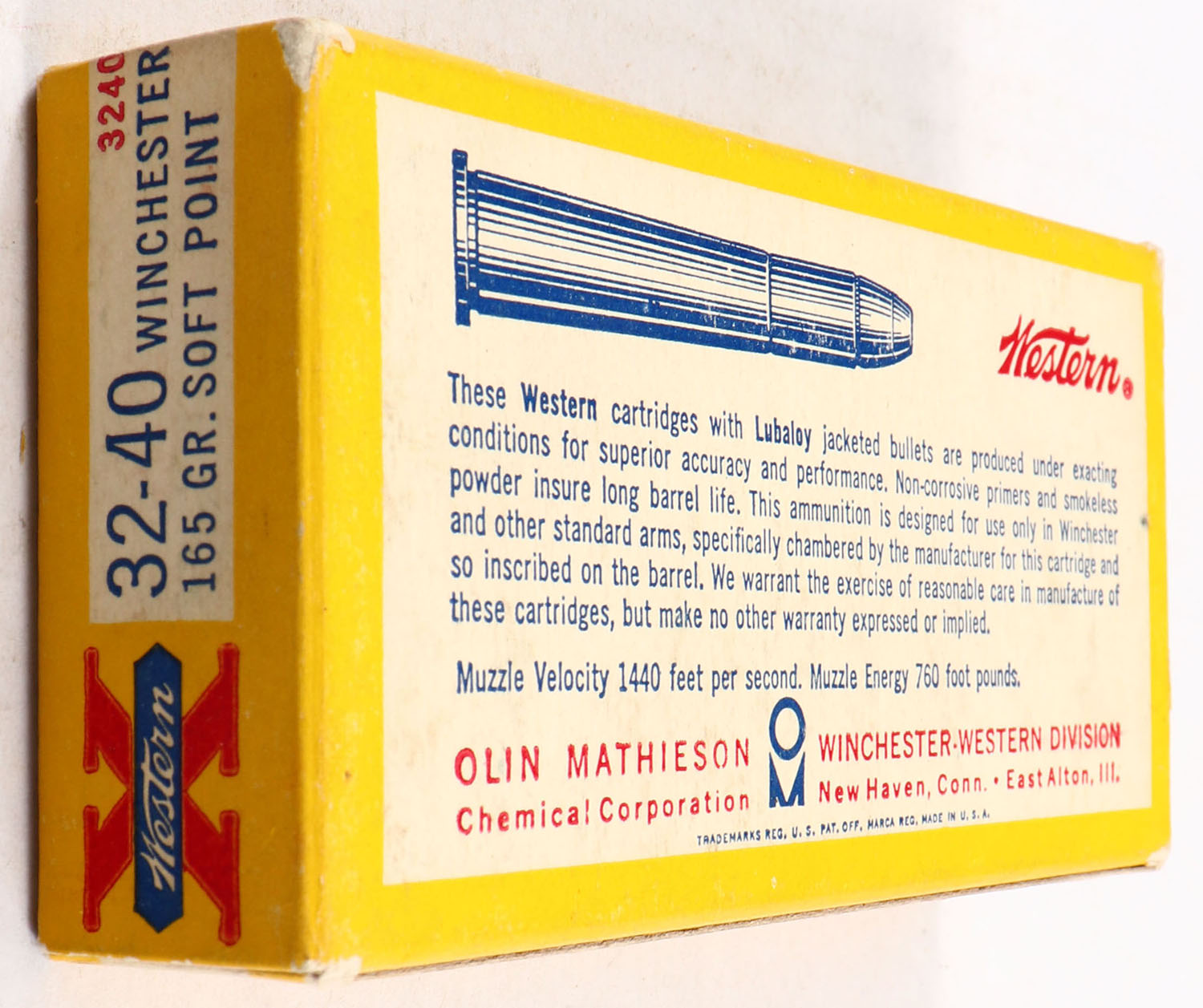 Western, X, .32-40 Winchester, 165 Grain Soft Point, Full, 1pc. Yellow white & red box, box is very solid with excellent color, very minor corner wear, edges are mostly crisp, top has been written on, end flaps are solid, ammo is excellent. Grade: Excellent + - Value: 50 to 150