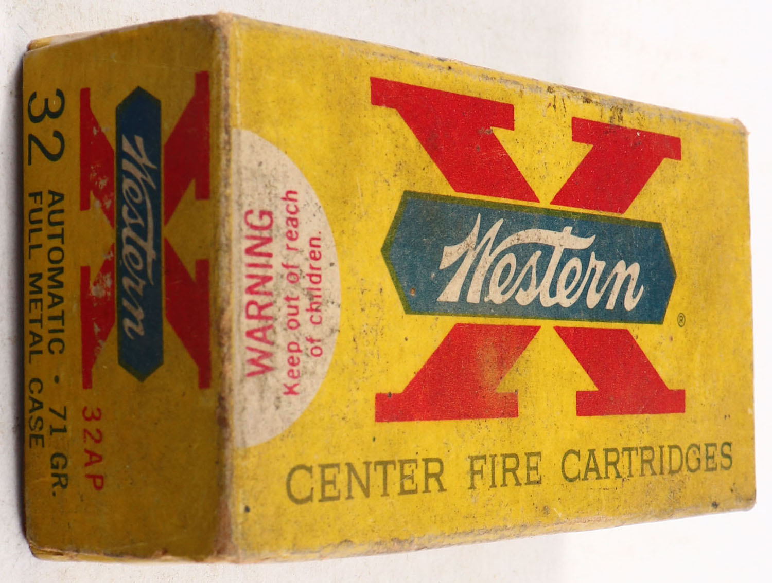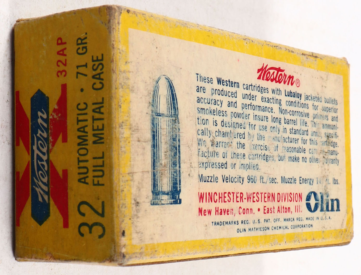 Western, X, .32 Automatic, 71 Gr. Full Metal Case, Full 1pc. Yellow red & blue box, box is solid with good color, age soiling, minor edge & corner wear, has age soiling, end flaps are solid, ammo is very good. Grade: Good ++ - Value: 16 to 60