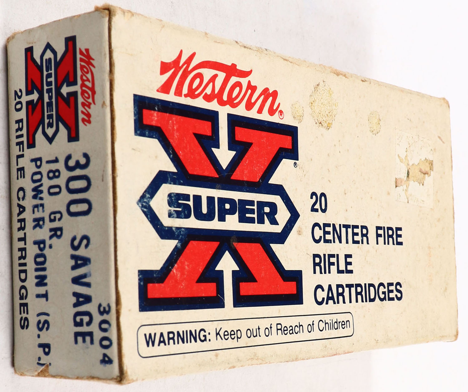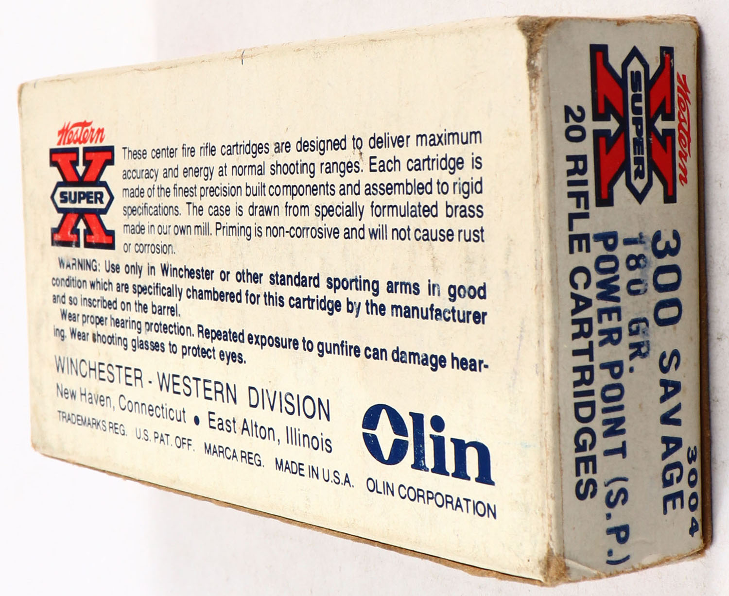 Western, Super-X, .300 Savage, 180 Grain Power-Point, Full of Dominion ammo, 1pc. White red & black box, box is solid with good color, minor age soiling, some shelf wear, has edge & corner wear, end flaps are solid, ammo is excellent. Grade: Very Good ++ - Value: 20 to 60