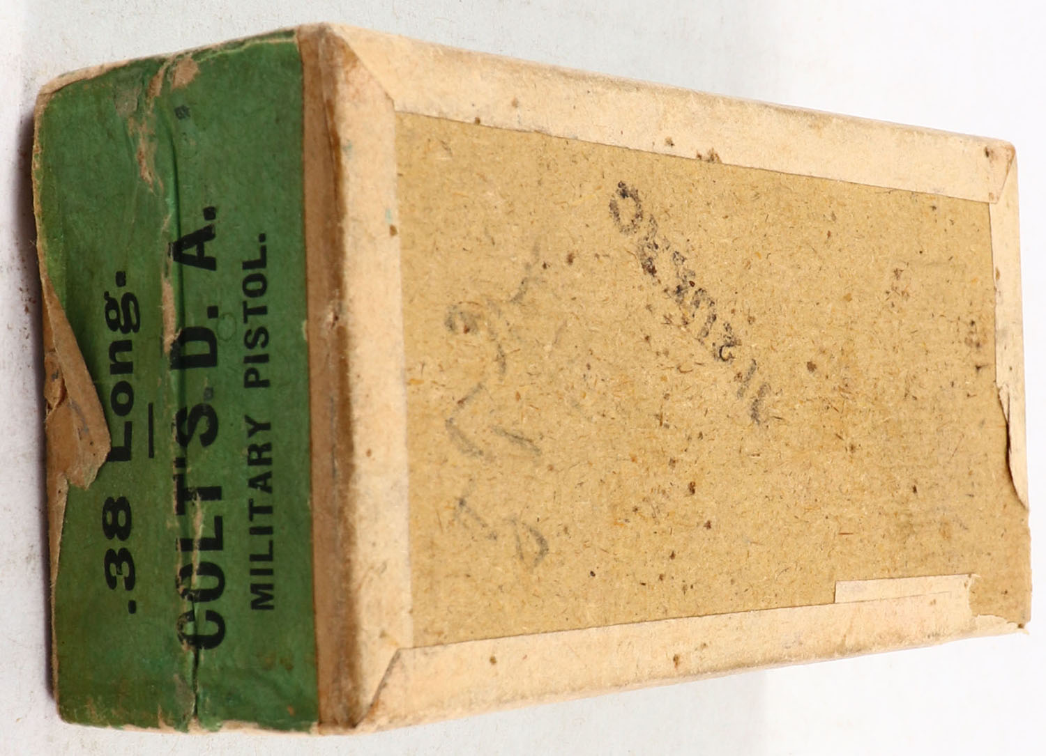 Peters, Central-Fire Cartridges, .38 Long Colt, Solid Head, FULL & SEALED, 2pc. Buff box with green top & side sealing labels, box is solid with very good to excellent color, minor staining & color fading, some edge & corner wear, labels are intact. Grade: Very Good + - Value: 80 to 240