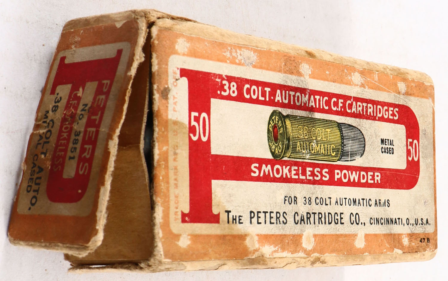 Peters, C.F. Cartridges, .38 Colt Automatic, Metal Cased, Full, 2pc. Buff box with white red & orange wraparound label, lid has 2 seam splits on left end of lid, good to very good color, minor age soiling, some staining & shelf wear, some edge & corner wear, label is intact, ammo is excellent. Grade: Good ++ - Value: 20 to 60