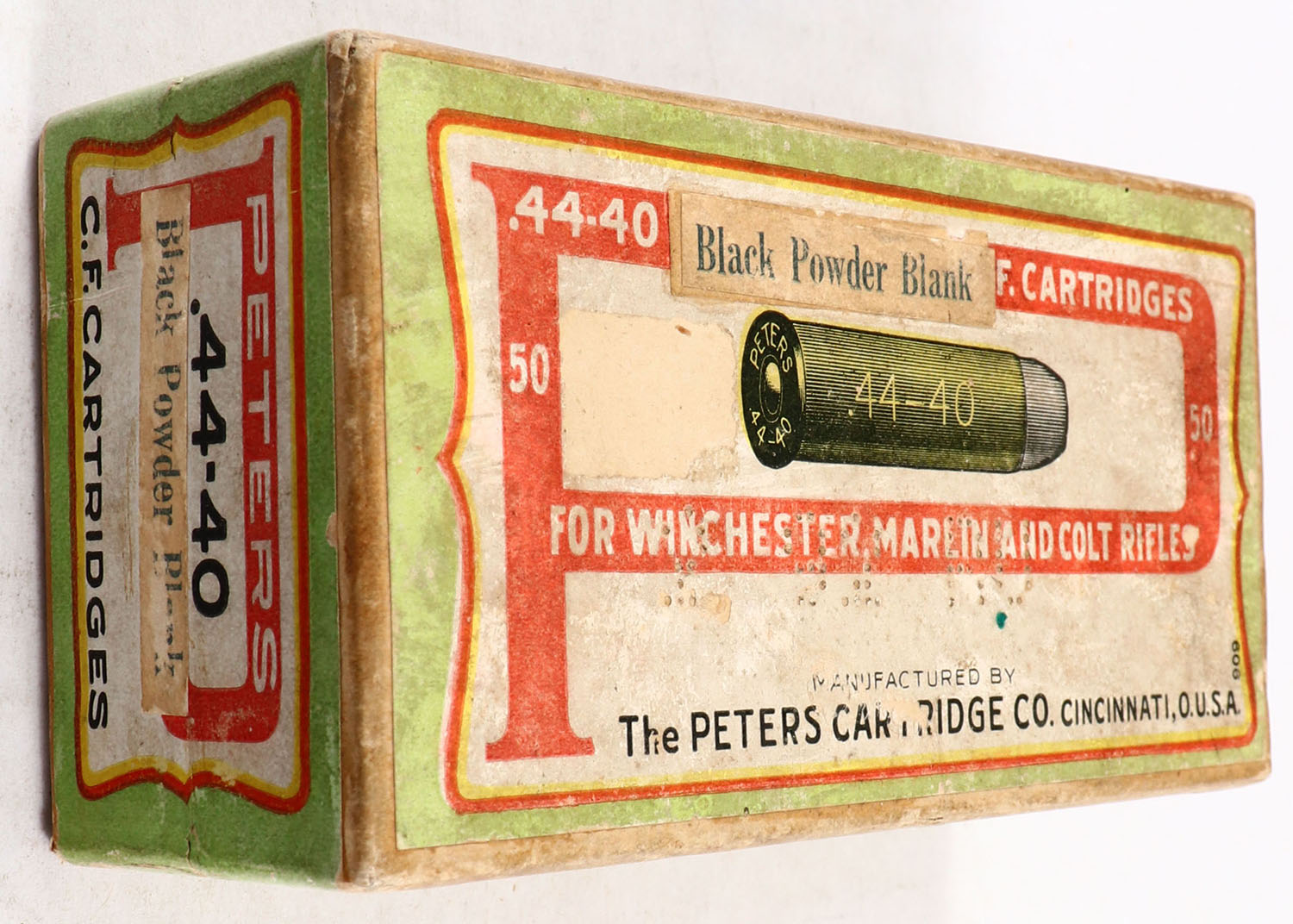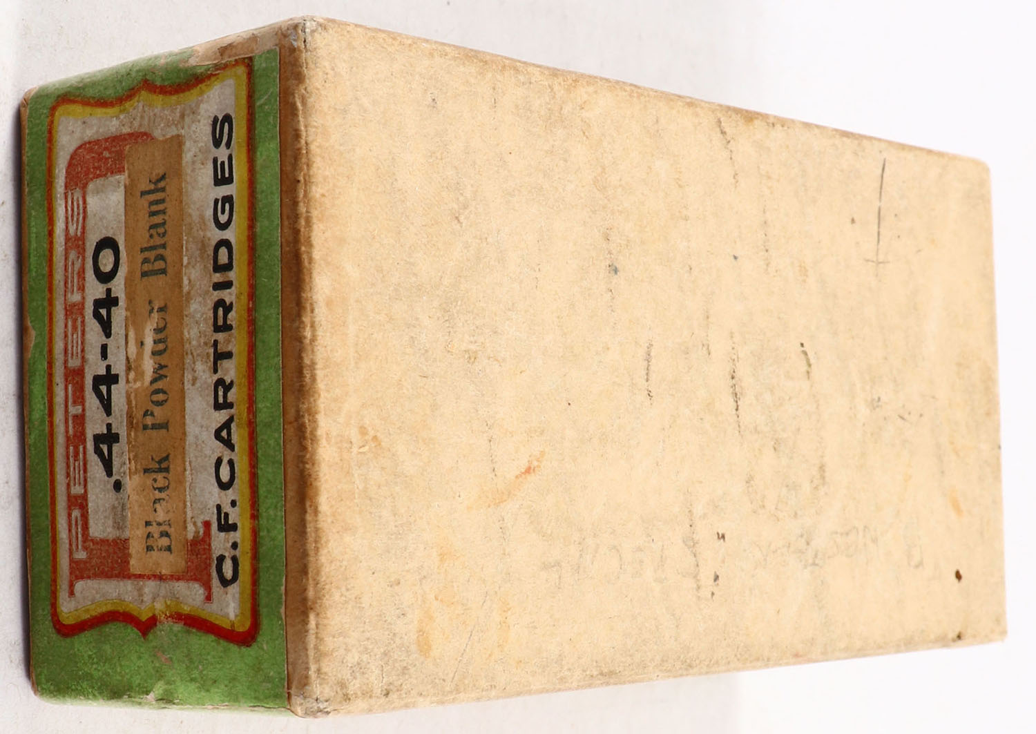 Peters, C.F. Cartridges, .44-40 Black Powder Blank, FULL & SEALED, 2pc. Buff box with white green & red labels, white ''Black Powder Blank'' over-labels, box is solid with very good color, some age soiling, very minor corner wear, edges are mostly crisp, labels & over-labels are intact. Grade: Excellent - Value: 40 to 120