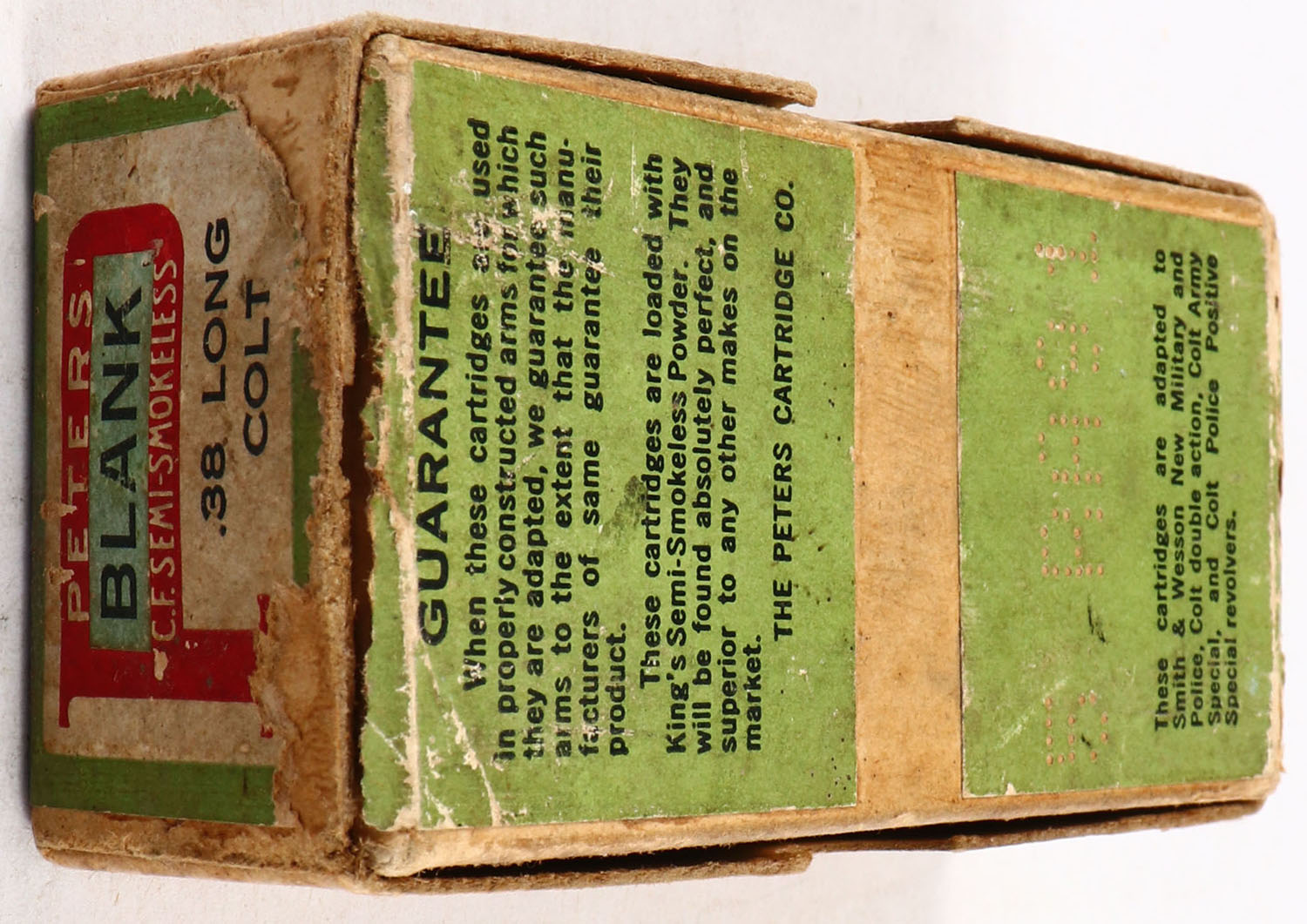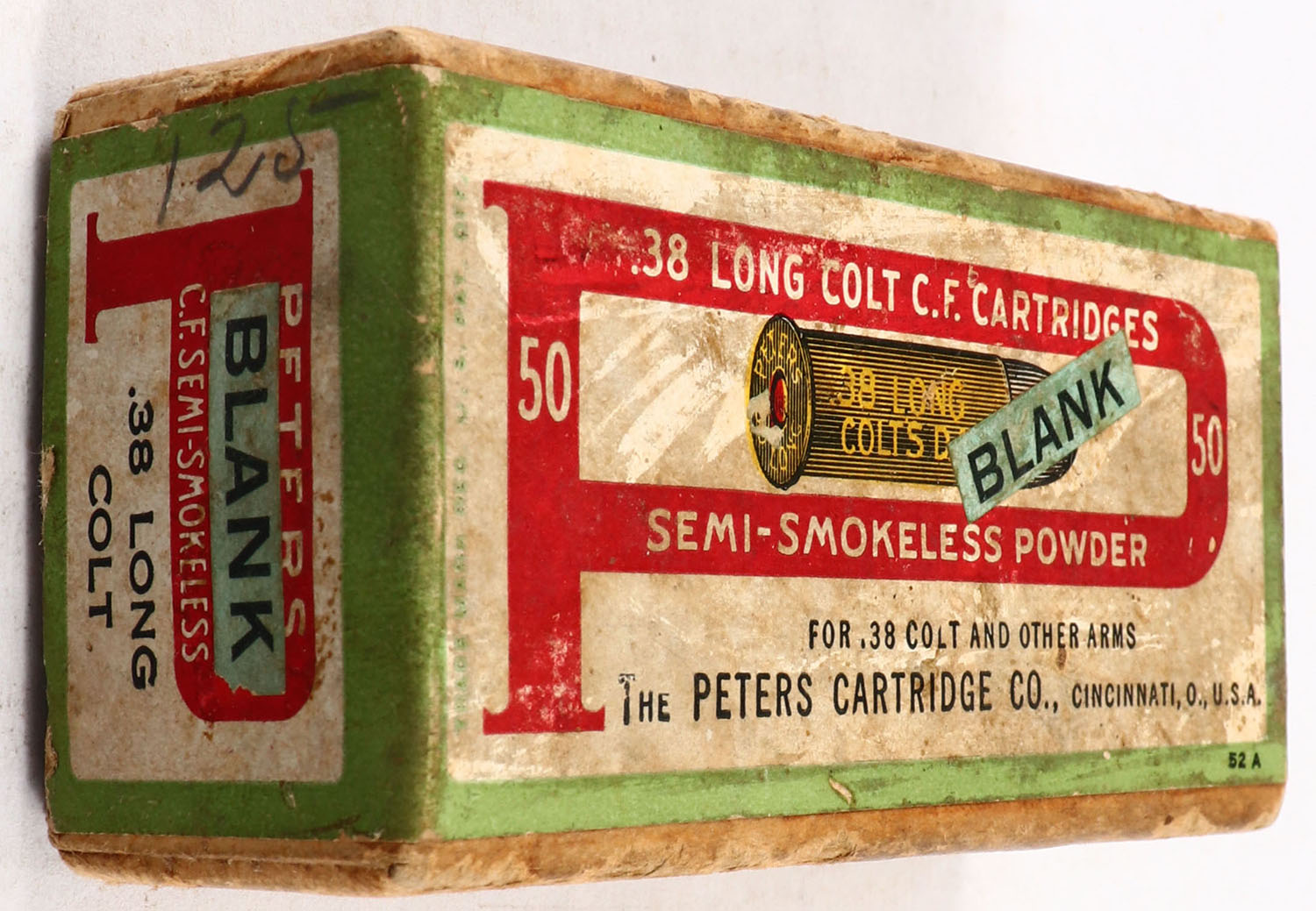 Peters, C.F. Cartridges, .38 Long Colt Blank, Partial 44rds. 2pc. Buff box with white red & green wraparound label, blue ''Blank'' over-label, box is solid with good to very good color, age soiling, minor edge & corner wear, label is intact, ammo is very good. Grade: Very Good ++ - Value: 16 to 60