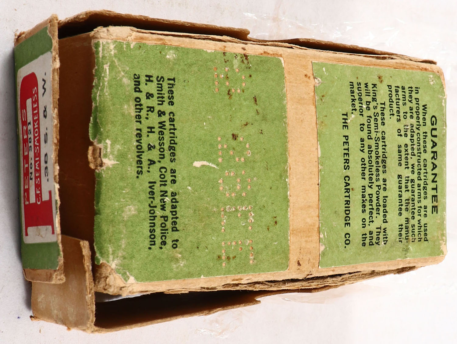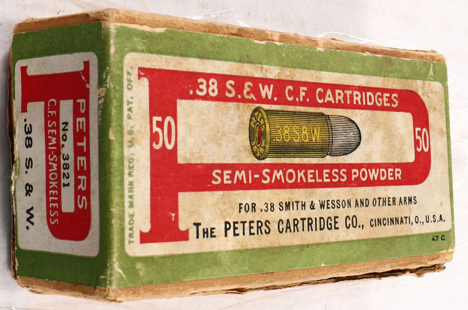 Peters, C.F. Cartridges, .38 Smith & Wesson, Semi-Smokeless Powder, Partial 44rds. 2pc. Buff box with white red & green wraparound label, seam split to bottom front edge, seam split to front edge of lid, vertical seam splits to both right end corners of lid, very good color, some age soiling, some edge & corner wear, label is intact, ammo is excellent. Grade: Good - Value: 20 to 60