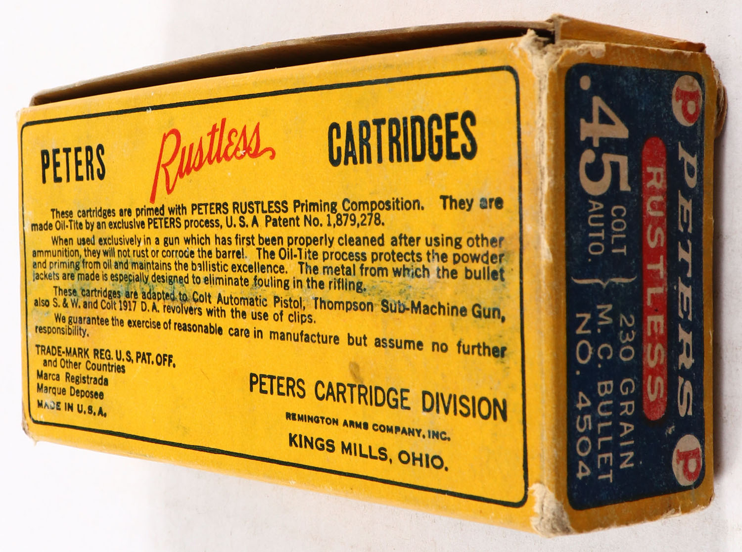 Peters, Rustless, .45 Colt Auto. (.45 Auto.), 230 Grain M.C. Bullet, Full, 1pc. Blue yellow & red box, box is solid with very good to excellent color, minor age soiling & shelf wear, factory seam loosened, some very minor corner wear, end flaps are solid, ammo is excellent. Grade: Very Good ++ - Value: 40 to 80