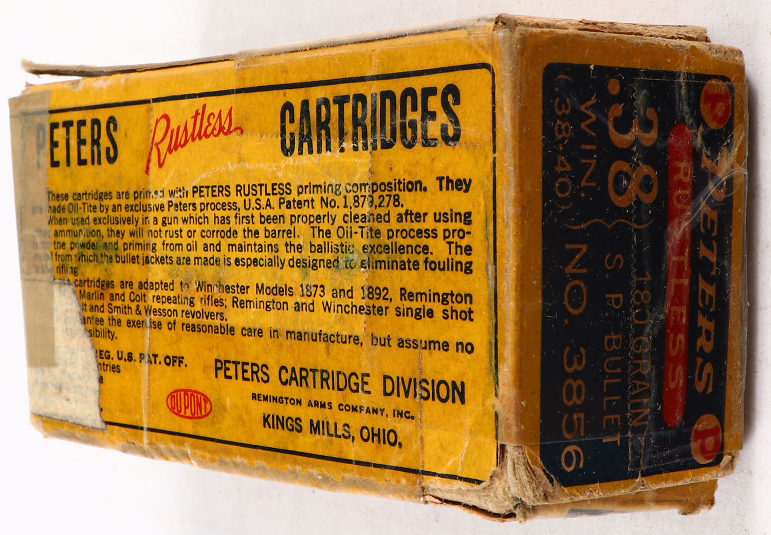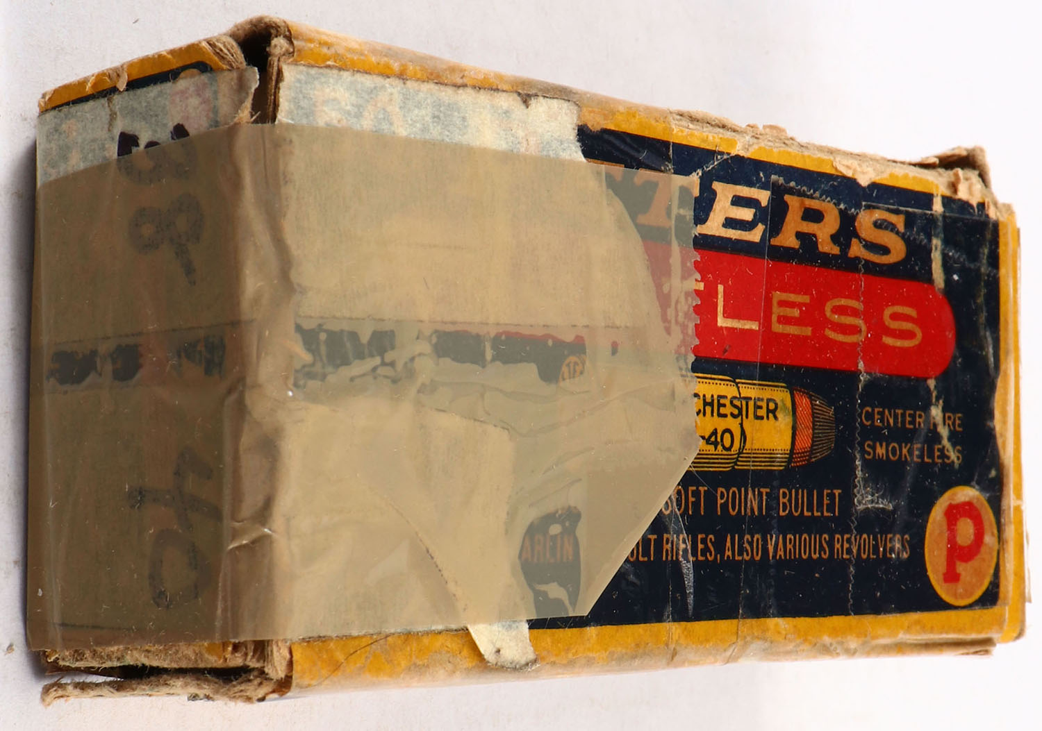 Peters, Rustless, . .38-40 Winchester, 180 Grain S.P. Bullet, Partial 45rds. 1pc. Blue yellow & red box, box is covered in tape with very good color, age soiling, edge & corner wear, ammo is excellent. Grade: Poor ++ - Value: 20 to 80