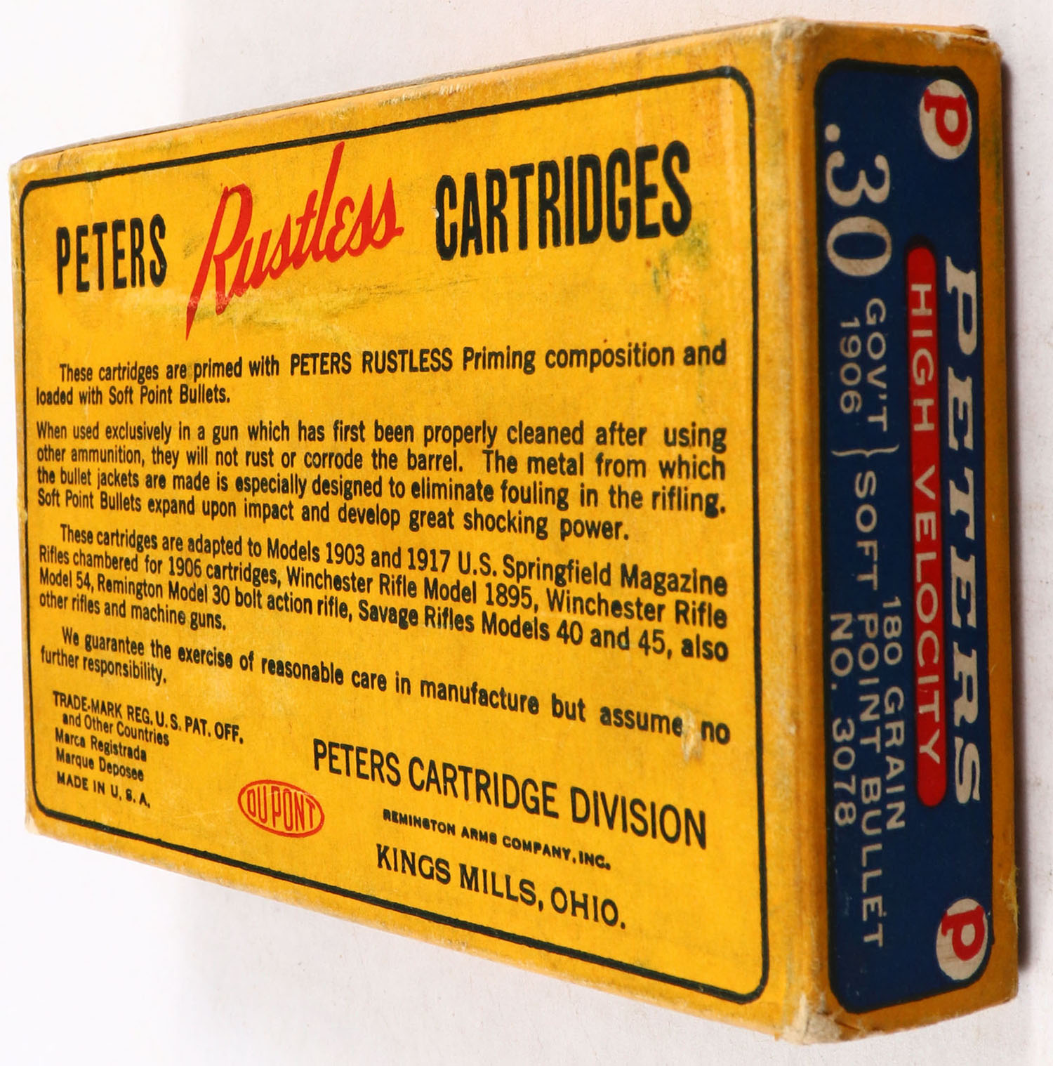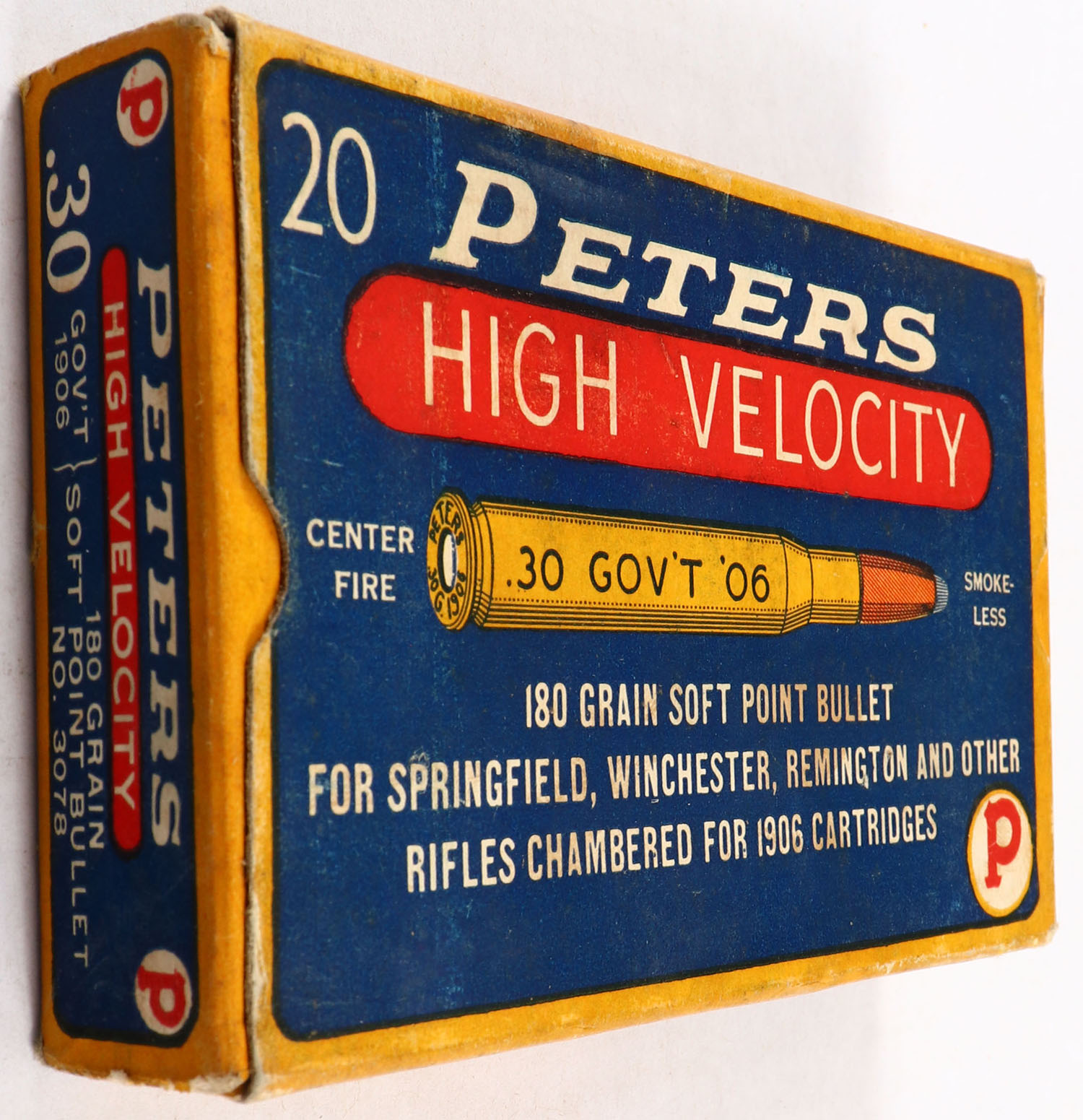 Peters, High Velocity, .30 Gov't 06 (.30-06), Smokeless, 180 Gr. Soft Point Bullet, 1pc, Full, yellow box with blue & red label & white/black print, box is solid with excellent color, minor edge & corner wear, ammo is very good. Grade: Excellent - Value: 20 to 60