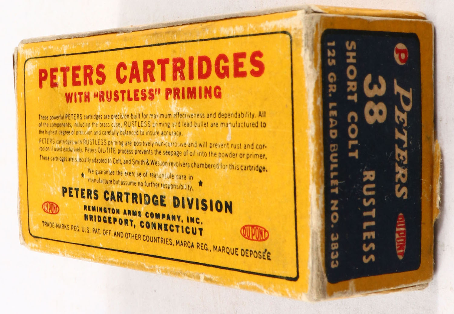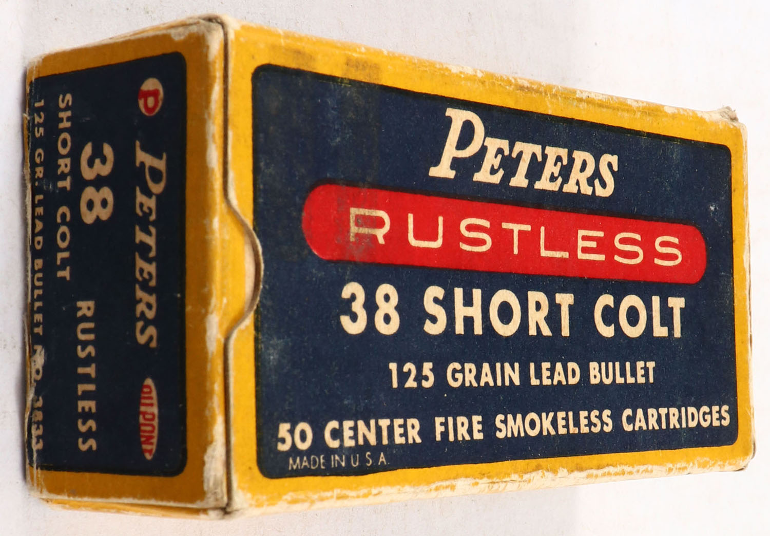 Peters, Rustless, .38 Short Colt, 125 Grain Lead Bullet, Full, 1pc. Blue yellow & red box, box is solid with very good to excellent color, minor age soiling, minor edge & corner wear, end flaps are solid, ammo is excellent. Grade: Excellent - Value: 20 to 60