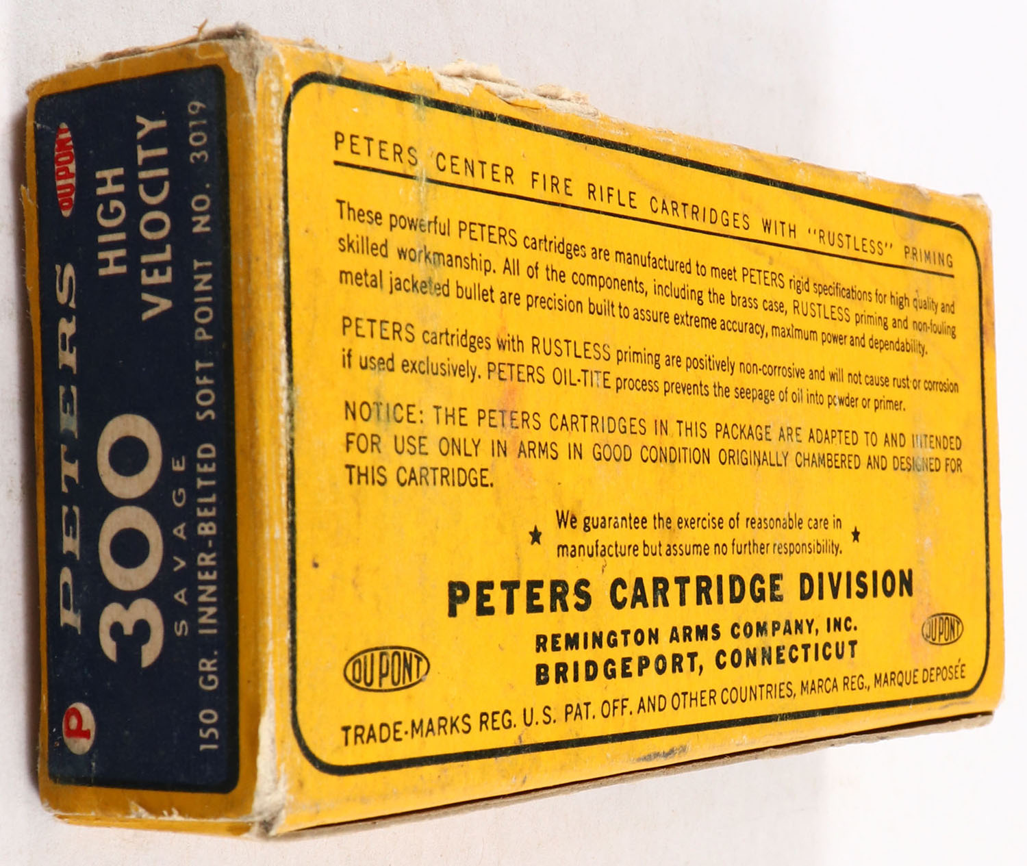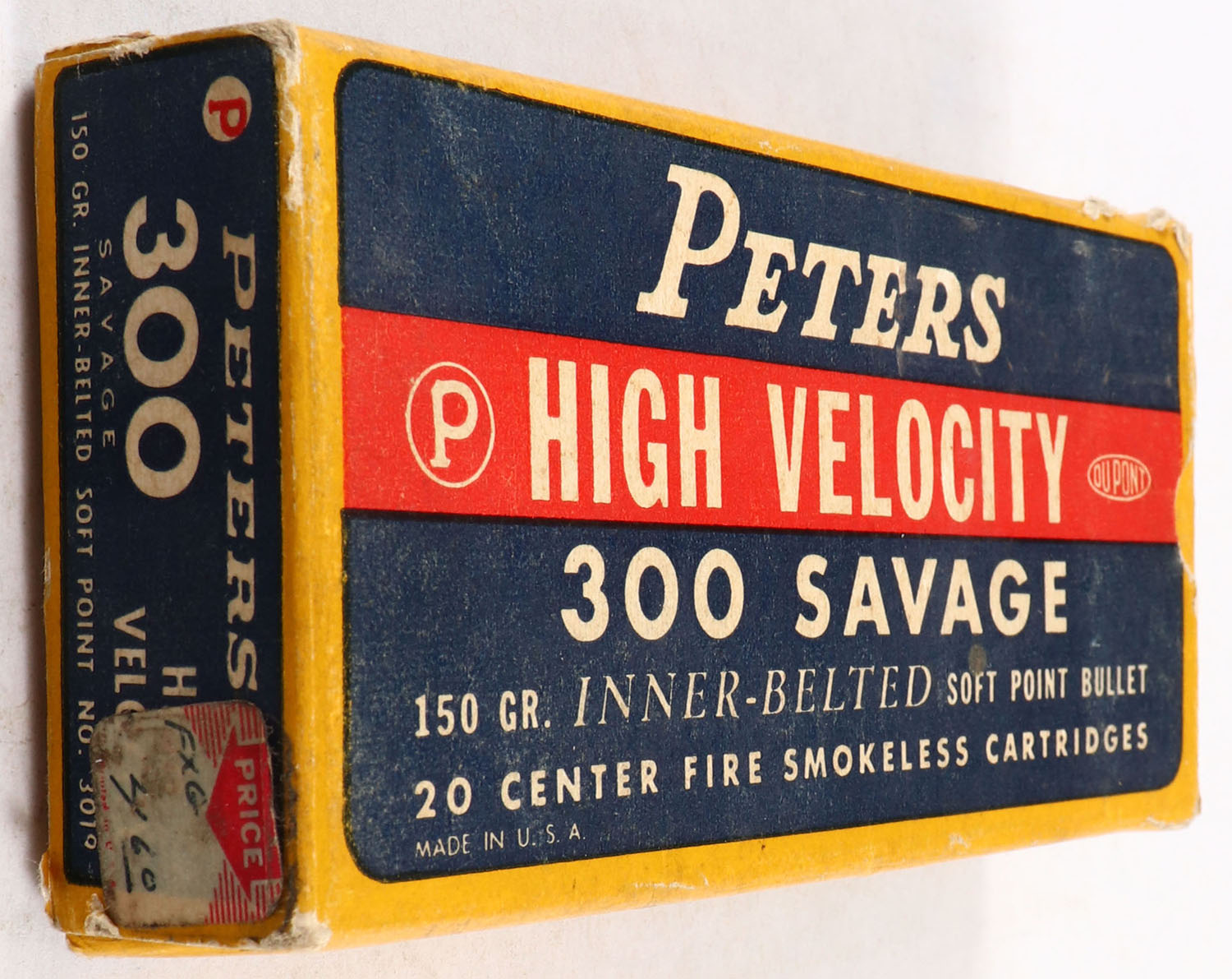 Peters, High Velocity, .300 Savage, 150 Grain Inner-Belted, Soft Point Bullet, Partial 18rds, 1pc. Blue yellow & red box, box is solid with excellent color, very minor shelf wear, some corner wear, very minor edge wear, end flaps are solid, ammo is excellent. Grade: Very Good ++ - Value: 20 to 60