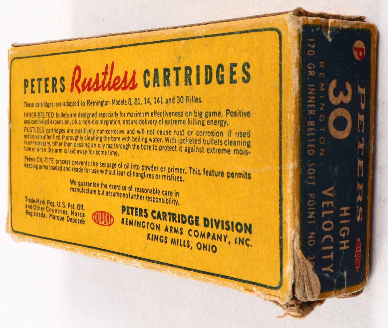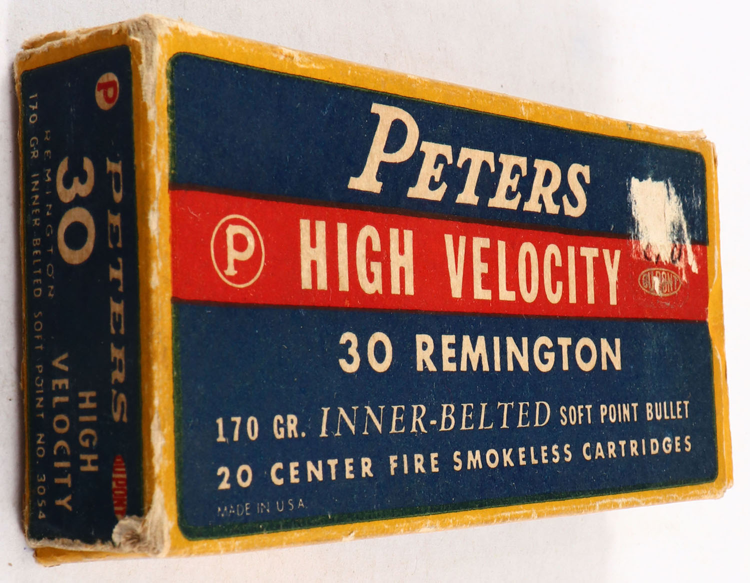 Peters, High Velocity, .30 Remington, 170 Gr Inner-Belted soft point bullet, 1pc, Full., yellow box with blue/red label & white/black print, box is solid with very good to excellent color, minor age soiling, scuff on top, minor edge & corner wear, end flaps are solid, ammo is excellent. Grade: Very Good + - Value: 30 to 90