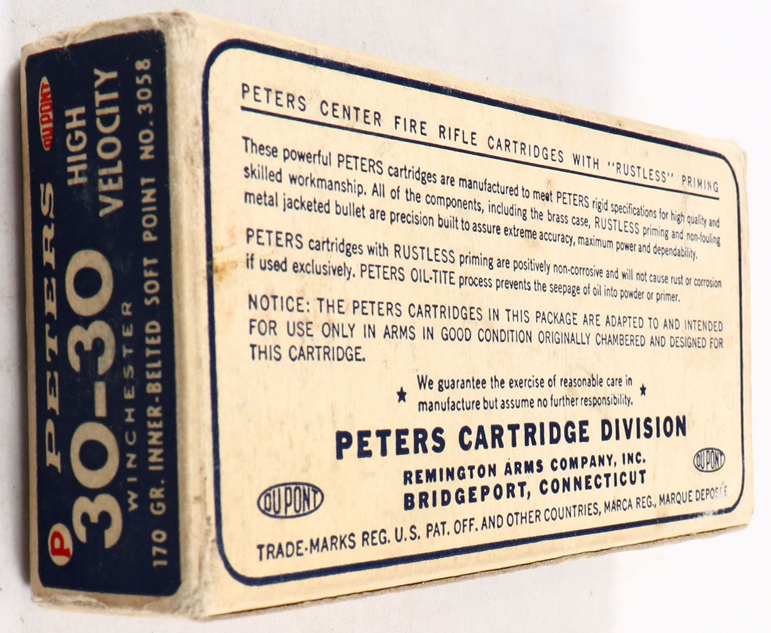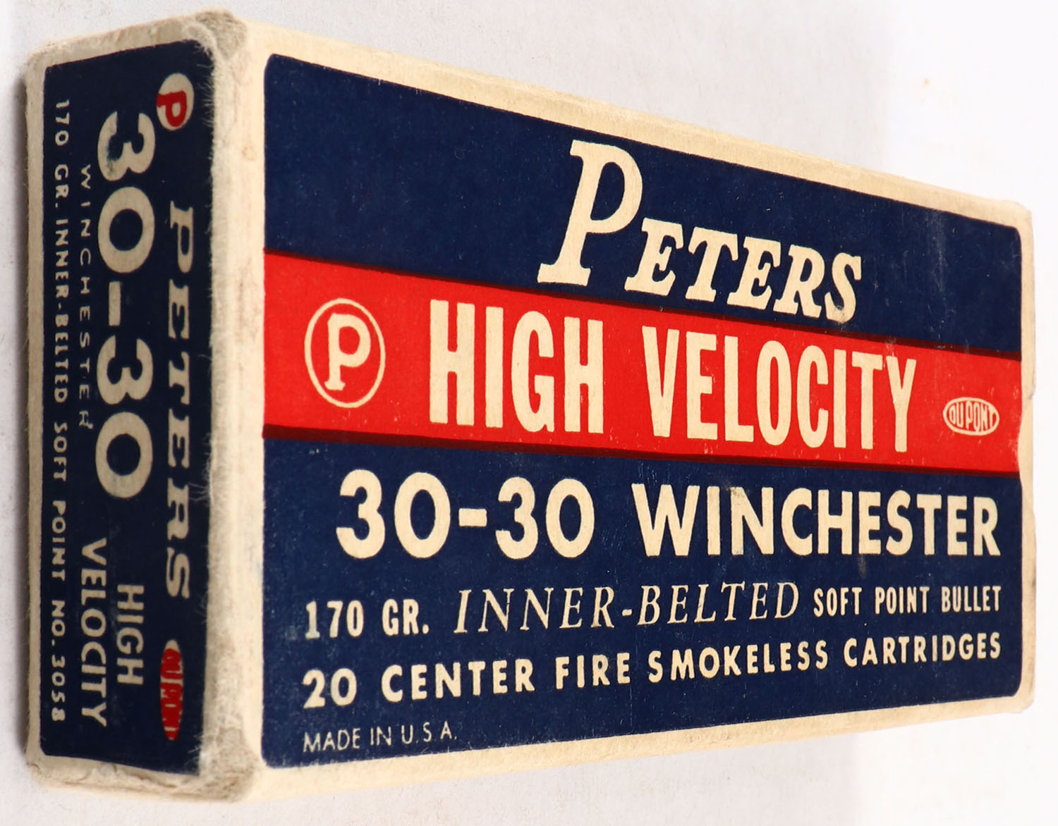 Peters, High Velocity, .30-30 Winchester, 170 Gr. Inner-Belted soft point bullet, smokeless, 1pc, Full, white box with blue/red label & white print, box is solid with excellent color, very minor age soiling, minor corner wear, edges are crisp, end flaps are solid, ammo is excellent. Grade: Excellent - Value: 10 to 40