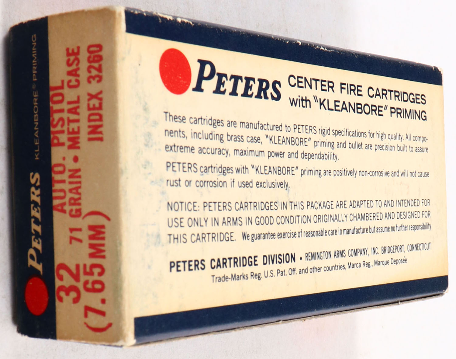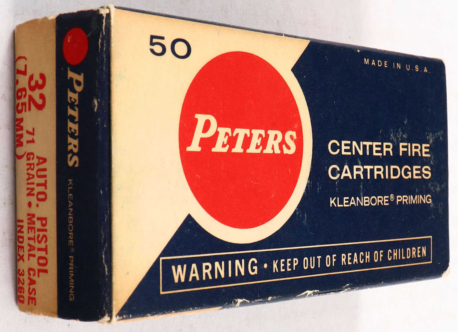 Peters, Rustless, .32 Auto Pistol, 71 Gr. Metal Case Bullet, Full, 1pc. Blue white & red box, box is solid with good color, has light age soiling with rub wear, some edge & corner wear, ammo is excellent. Grade: Very Good ++ - Value: 20 to 60