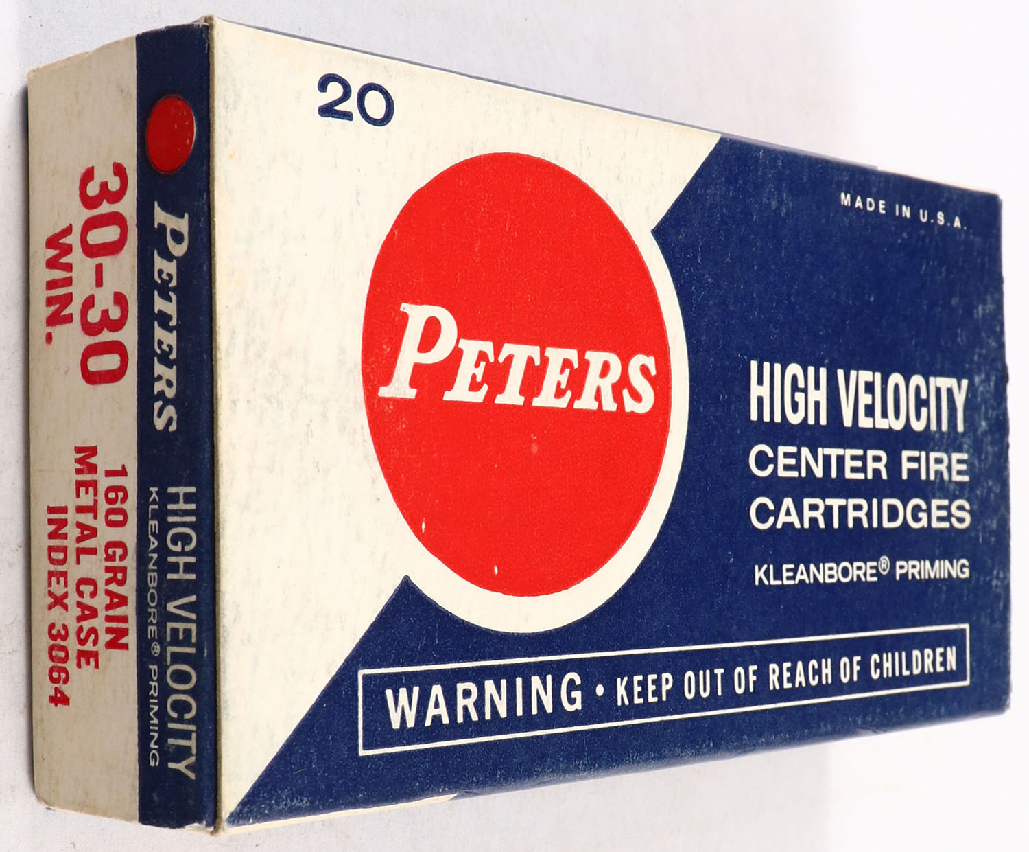 Peters, High Velocity, .30-30 Winchester, 160 Grain Metal Case, Full, 1pc. Blue white & red box, box is solid with excellent color, minor shelf wear, edges are mostly crisp, end flaps are solid, ammo is excellent. Grade: Excellent - Value: 20 to 60