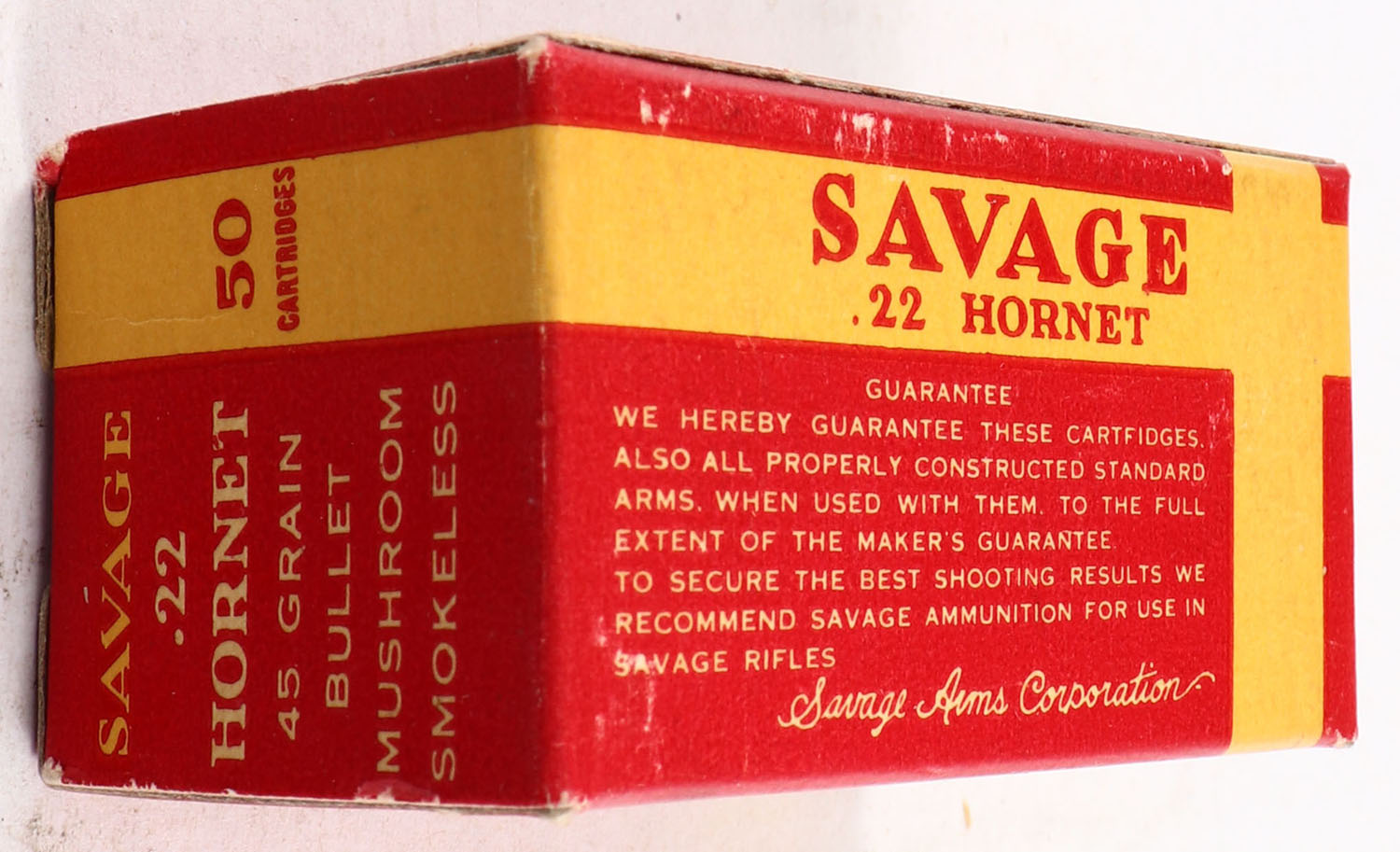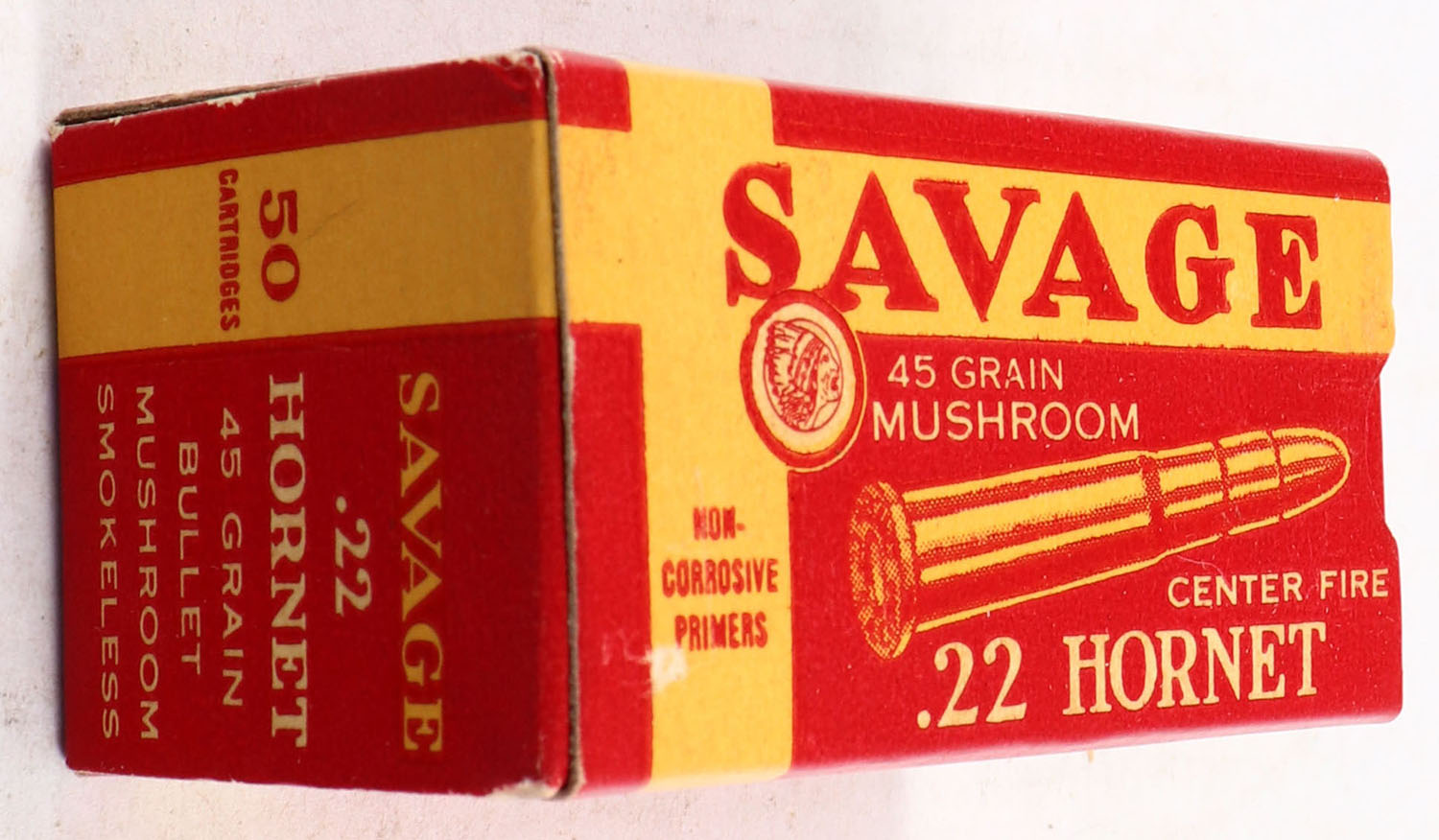 Savage, Center Fire, .22 Hornet, 45 Grain Mushroom, Full, 1pc. Red & yellow box, box is near mint with excellent color, only very minor corner wear, edges are crisp, end flaps are solid, ammo is excellent. Grade: Excellent ++ - Value: 100 to 300
