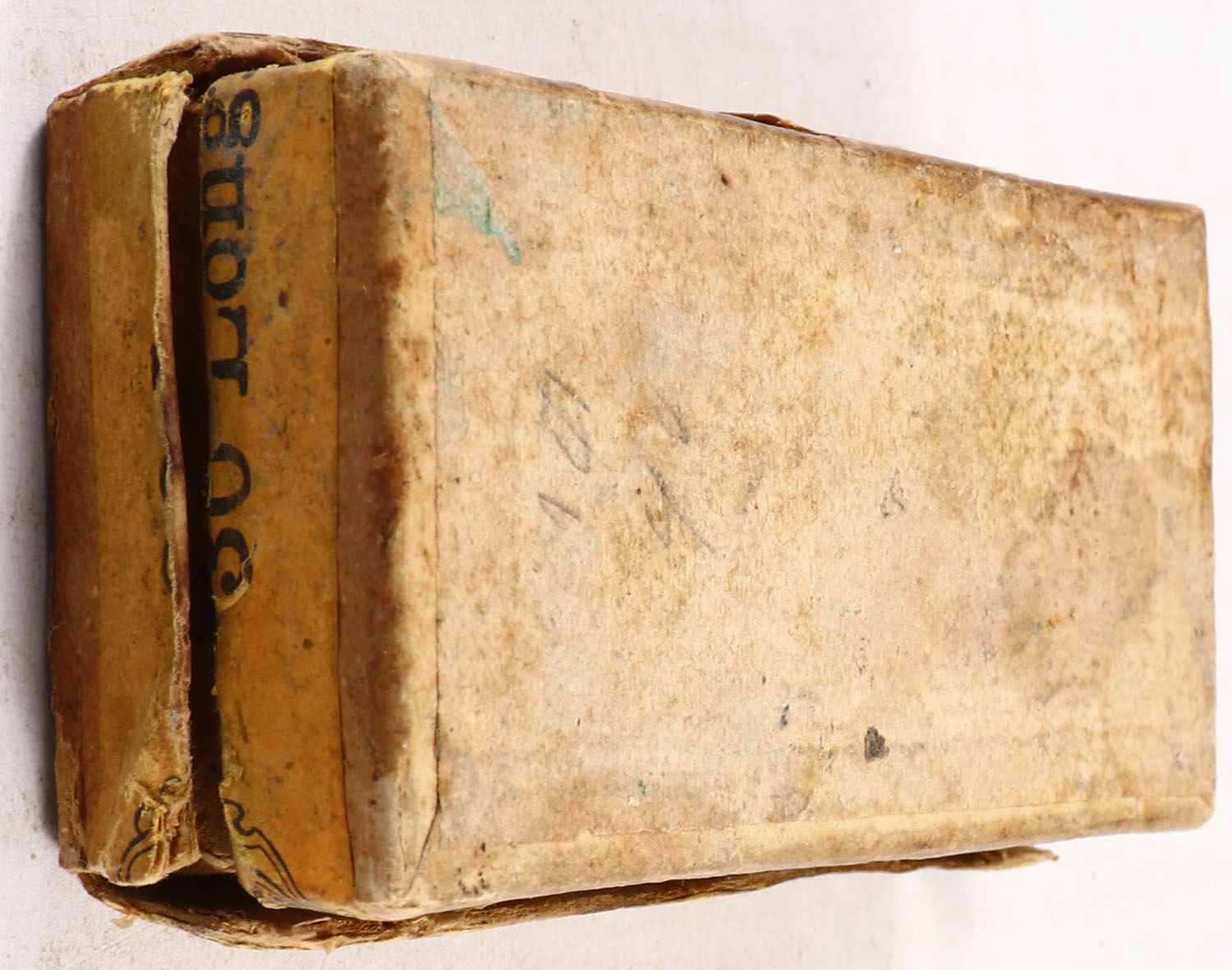 U.S., Metallic Cartridges, .30 Long Rim Fire, Partial 37rds. 2pc. Buff box with gray top & orange side sealing labels, vertical seam splits to all corners of lid, partial seam split to top front edge, fair to good color, age soiling, edge & corner wear, labels are intact, ammo is good to very good. Grade: Good - Value: 16 to 60