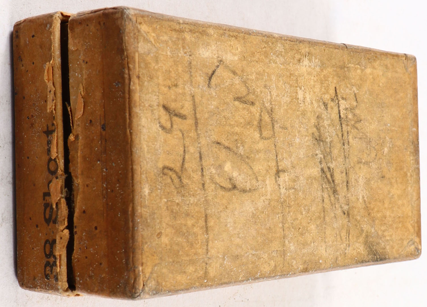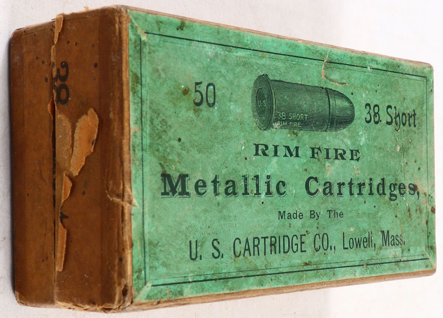 U.S., Metallic Cartridges, .38 Short Rim Fire, Full, 2pc. Buff box with green top & buff side sealing labels, box is solid with very good color, vertical seam splits to both left end corners of lid, some age soiling & corner wear, edges are mostly crisp, labels are intact, ammo is fair to good. Grade: Very Good - Value: 20 to 60